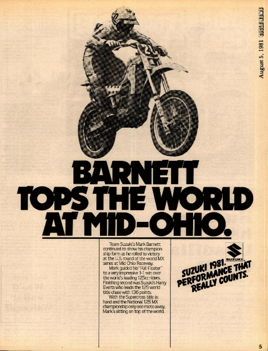 Barnett knew that Mid-Ohio would be hosting a 125cc GP for the last time in 1981. It had been announced by the FIM that since the Americans had failed to show at the last two Motocross and Trophee des Nations races in Europe, they were losing the 125cc Grand Prix at Mid-Ohio after a seven-year run. Barnett, who hailed from Illinois, always enjoyed racing at Mid-Ohio.
