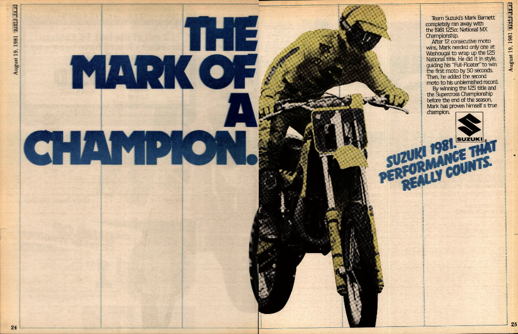 That 1981 season ended with Mark Barnett becoming the one and only rider in AMA Motocross history to win the 125cc AMA National Championship as well as the AMA Supercross crown, with a USGP win to boot.
