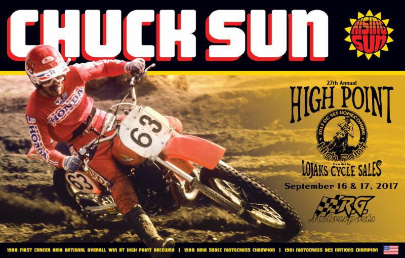 "I am excited to ride the newly redesigned High Point Raceway with my friends while we celebrate vet racing," said AMA Motocross Champion and past High Point winner Chuck Sun. "High Point has always been a special track to me since I won my first race there. It's a wonderful experience for me and a great honor, I'm really looking forward to it."