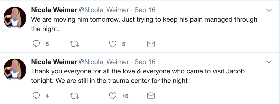 Jake’s wife, Nicole, tweeted last night that Jake would stay in the trauma center for the night, but that they would be moving him tomorrow [today].