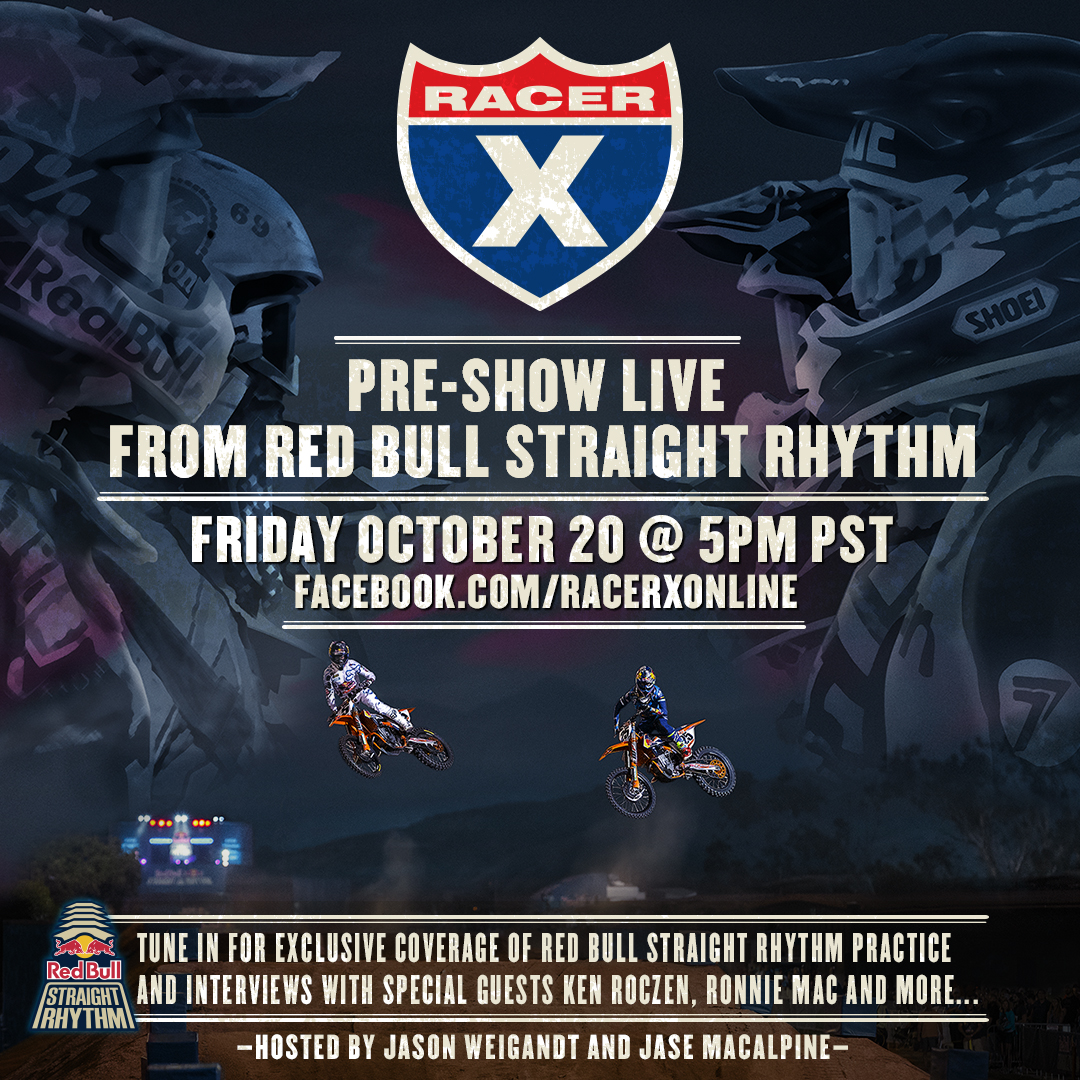 Are you ready for Red Bull Straight Rhythm on Saturday? Get a jump on the action with a live broadcast from the track on Friday, October 20 starting at 5 p.m. Pacific. We'll host it on our Racer X Facebook page.