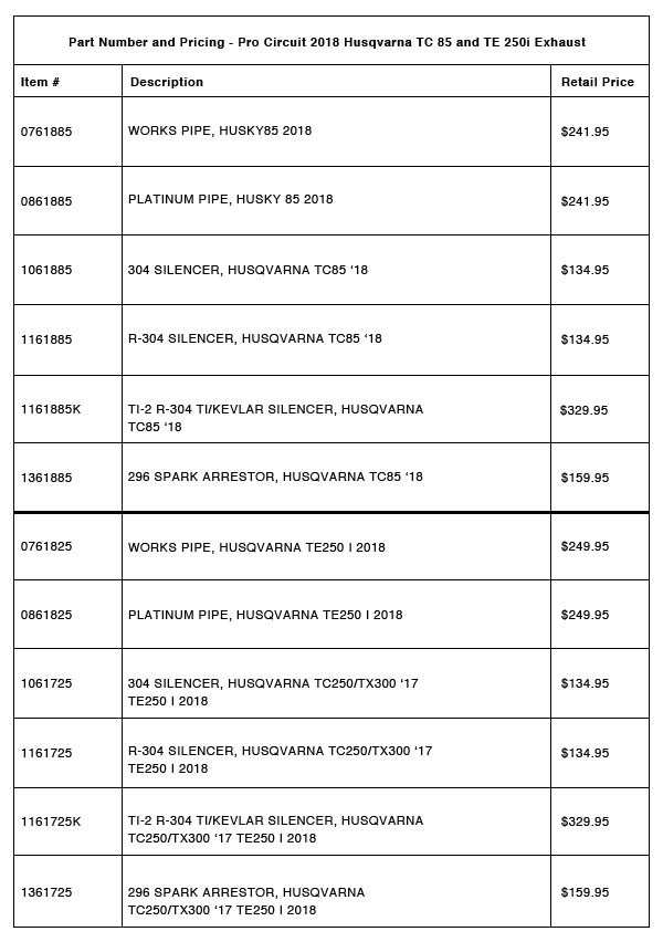 CORONA, CA - Being dedicated to providing our customers with the best two-stroke exhaust products is what we're all about here at Pro Circuit. For 40 years, we've built championship winning two-stroke pipes and silencers for all kinds of dirt bikes and ATVs. Our latest release includes Works and Platinum pipes, Ti-2, R-304, 304 and Type 296 silencers for the 2018 Husqvarna TC 85 and TE 250i models that offer significant performance and horsepower gains across the entire RPM range. Bolt on a championship winning Pro Circuit pipe and silencer and be ready to smoke your competition.