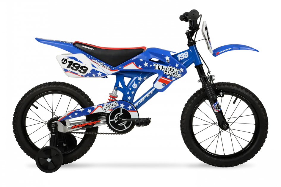 Young fans looking to emulate Travis Pastrana’s FMX exploits can ride off to exciting adventures on the 16-inch Moto Hyper Nitro Circus Bike. It features motocross-style fenders with authentic Nitro Circus graphics – including Travis’ signature 199 number - plus a saddle seat, adding some hi-octane visuals to this pedal-powered riding machine. It is built with a steel oversized frame, a steel handlebar, 16-inch rims and knobby tires. It also has standard size pedals and front brakes for an easy way to stop. With only one speed, there are no complicated gears. Training wheels are included for beginners who are still learning to ride. The easy to assemble 16-inch Moto Hyper Nitro Circus Bike is available for $79.00.