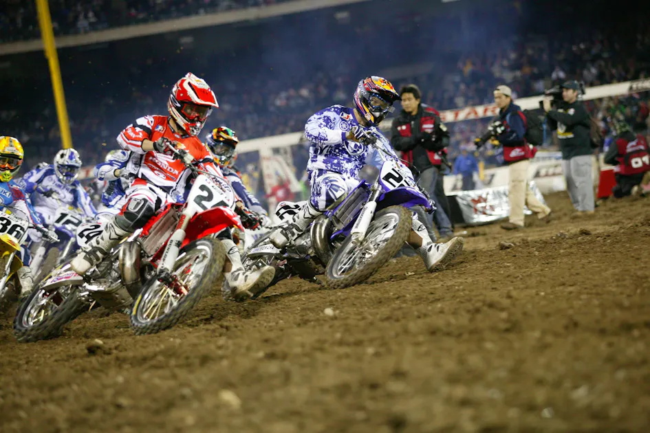 In a wild Anaheim opener, JGR Yamaha’s Josh Grant wins the main event after James Stewart and Chad Reed tangle, Reed’s front tire touching Stewart’s back tire in the whoops, and then Kevin Windham hits the downed Stewart. Afterward, Stewart can’t start his bike and DNFs the race, though he will ultimately win the 2009 AMA Supercross Championship.
