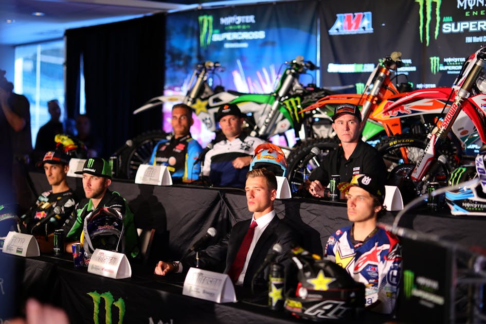 Welcome to Racerhead, coming to you from the Diamond Club at Angel Stadium in Anaheim on the eve of the 2018 Monster Energy AMA Supercross Championship. The press conference is quite literally happening behind us, and Jason Weigandt will fill you in below on what all is being said and done at the big table. Ken Roczen is here in his suit, looking dapper and happy to be back. Chad Reed admits that he feels a little rusty and overweight. Eli Tomac, Cooper Webb, Marvin Musquin, Jason Anderson, and more—they are all here and looking ready to get back on it. Not so ready are the Ryans, as both Dungey and Villopoto are here—the last eight championships if you add them up—and they also look happy and content with being retired. In fact, both are in the back of the room, just relaxing and taking it all in.