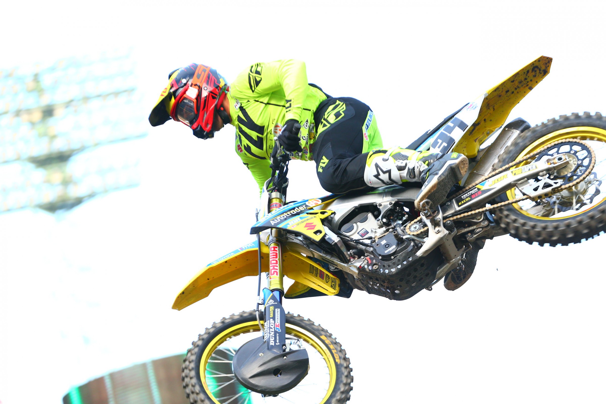 The first 450SX main got underway perfectly for Eli Tomac. The Monster Energy Kawasaki rider edged out Justin Barcia and wasted no time in attempting to sprint away from the pack. Barcia ran second, with Weston Peick in third. Marvin Musquin ran fourth while Ken Roczen was roughly midpack after a bad start. Several minutes in Peick saw Musquin go by, and a lap later, he started feeling pressure from Jason Anderson, who also proceeded to go by. Tomac, meanwhile, lost it in a rhythm lane all by himself, giving the lead to Barcia. Tomac, who looked stunned, was able to remount and rejoin the race but immediately started dropping spots. He was clutching at his back, and eventually pulled over. Turns out his pants had come undone and he had to fasten them to avoid a wardrobe malfunction. He tried to get going again but ended up just rolling around and pulling into the mechanic’s area. He must have had an additional problem because shortly after he rolled out of the stadium and into the pits.