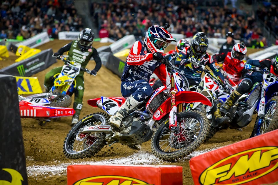 Although Eli Tomac hasn’t been mathematically eliminated from this championship, it’s pretty safe to say he’s out of it. The hits started at A1 when he crashed out while leading and they haven’t stopped since, and tonight was no different. In fact, Tomac didn’t even make it a full lap before the trouble started. As the pack rounded the first turn, Tomac, along with Weston Peick, Malcolm Stewart, Ken Roczen, and Josh Grant, found himself hitting the dirt. He remounted, went to the mechanic’s area briefly, then motored back to the pits. Afterward we learned he’d ripped most of his grip off and the bike itself was pretty twisted up. If things weren’t bad enough after Tomac’s thirteenth last week in Oakland, he’s now seventy-seven points back of Jason Anderson. When it rains, it pours.