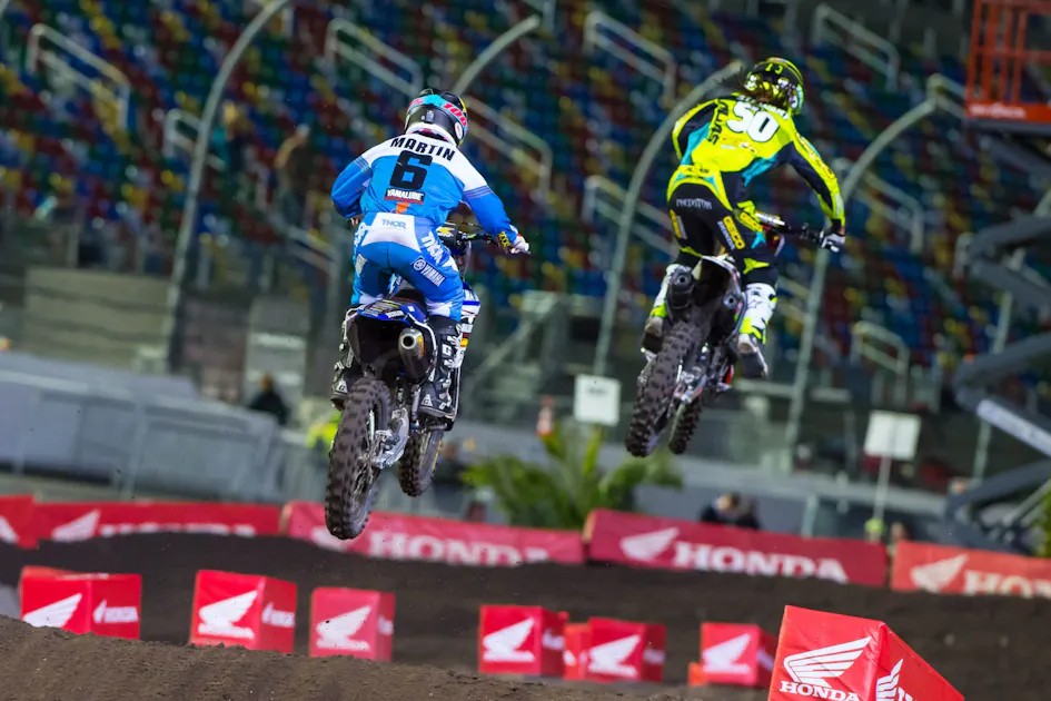 250SX was a tight battle between GEICO Honda’s Malcolm Stewart, Yamalube/Star Racing Yamaha’s Jeremy Martin, Rockstar Energy Husqvarna’s Martin Davalos, and Troy Lee Designs/Red Bull KTM’s Justin Hill. Stewart led the opening 12 laps but was passed late by Jeremy Martin, who went on to the victory. Stewart stalled on the final lap while running third and finished fourth behind Hill and Davalos.