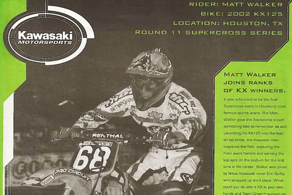 Team Honda's Ricky Carmichael took the win in the Houston Astrodome over his Honda teammate Nathan Ramsey, though RC was riding a CR250 two-stroke and Ramsey was aboard the company's new CRF450. Finishing third was Kawasaki rider Ezra Lusk.