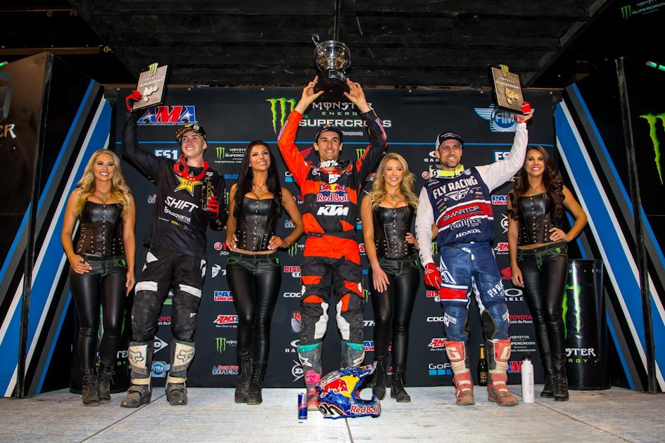 Musquin: To be honest, I’ve been waiting for that win for a long time. Last one is Anaheim 1, and I felt like I was riding better and better after I got that dislocated shoulder in Houston. I was getting better and better. I thought Daytona was going to be a good main, until I crashed. That’s racing. Like I said, I feel like I’m definitely capable of winning, but you got to put everything together and that’s not easy. Then today it was good. To be honest, we got the bike better this weekend, and that last practice, I know the track was better because they fixed it, but I was riding really smooth. I was the fastest by a little bit, too, so I was really happy. I just needed a good start and raced my own race. That was awesome. Obviously, you can say Tomac crashed, but he was still behind me and I was ready for a battle. That’s a bummer for the fans to see that, but I’ll take it. I was up there and riding my own race. To be honest, when Tomac went down after that, it was a big gap. It’s hard to keep pushing, but at the same time, you don’t want to make mistakes. I played it safe until the end.