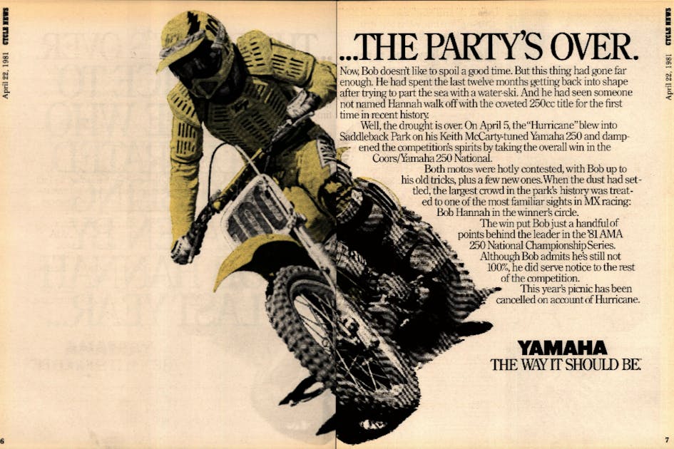 In one of the all-time epic motocross battles in AMA history, Bob "Hurricane" Hannah and Kent "the Rhinestone Cowboy" Howerton clashed at the Saddleback Park AMA 250 National. Hannah was coming off of a one-year hiatus after suffering a broken leg in a waterskiing accident, costing him the entire 1980 season. That allowed Suzuki's Howerton to more or less take over as America's premier 250cc rider. At the much-awaited '81 opener at Hangtown, Howerton won, which left Yamaha's Hannah seething. One week later he went to Saddleback determined to win at all costs, and he and Howerton ended up ramming into one and other often. In the end, Hannah proved to have the advantage and won the day, though Howerton would have the last laugh, winning another AMA 250cc Motocross Championship.