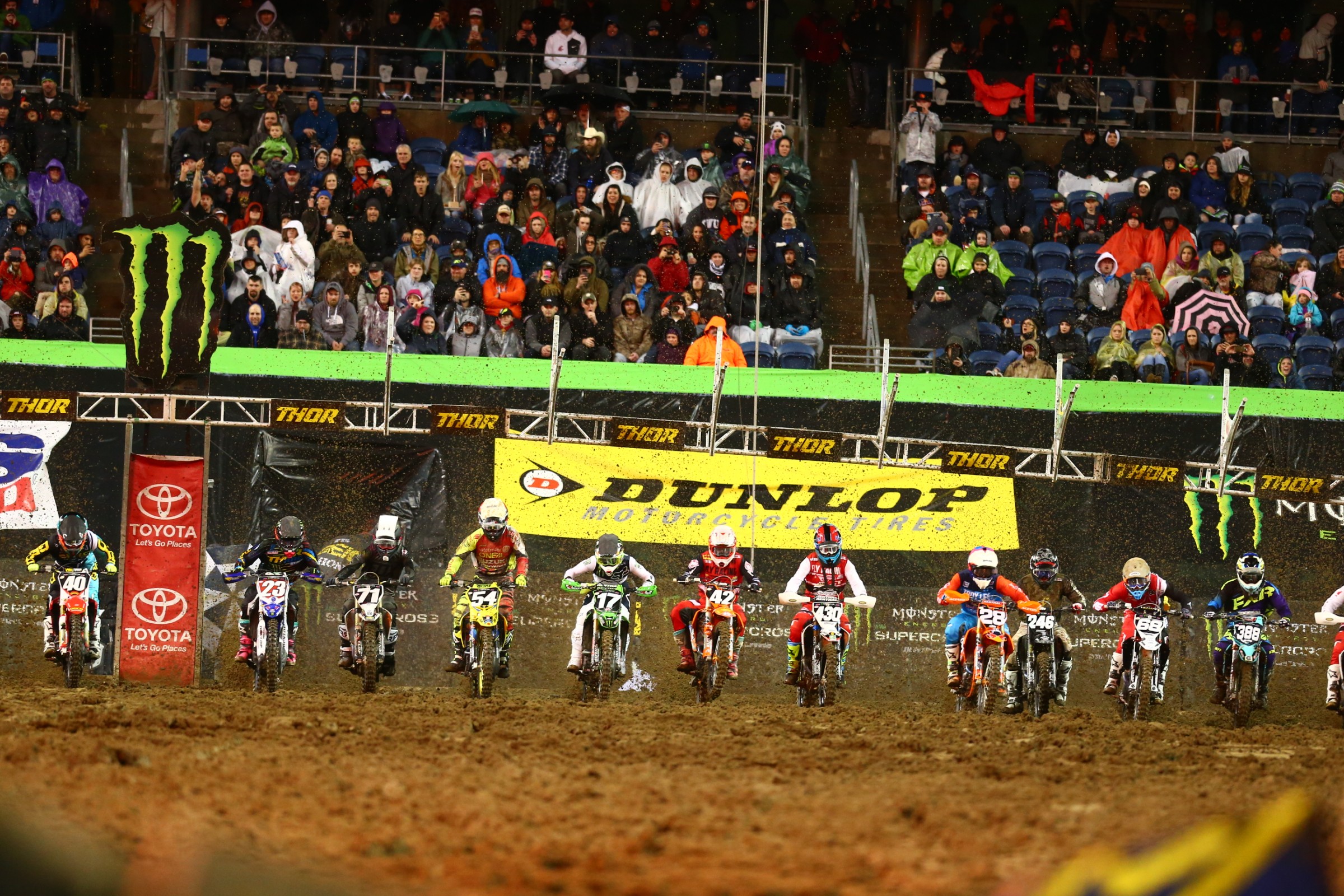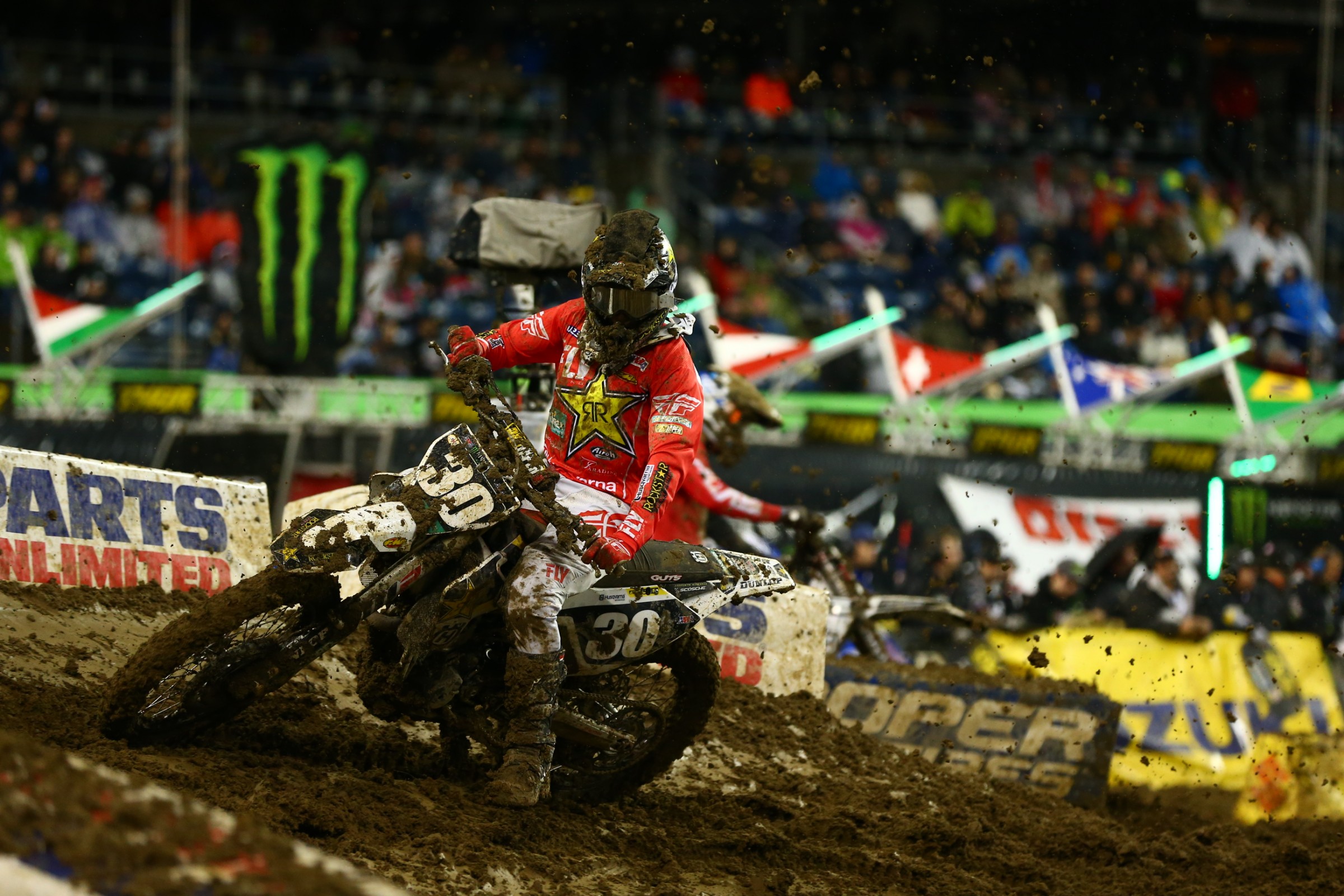 In the 450SX Class, the rain and slop didn’t end up having an adverse effect on Championship leader Jason Anderson, who seemed to handle the extreme slop just fine. Yes, he did go down multiple times in his heat race, something he would later attribute to pushing too hard, but even after all that he still took second. And in the main he put himself in a position to win by taking over the lead almost immediately. A mistake later in the race allowed a charging Eli Tomac to catch and pass him, but Anderson still finished on the box in second. In a year that’s presented all kinds of treachery and woe to the competition, Anderson yet again held strong, giving up a mere three points to Tomac. Anderson didn’t win the race, but walking from a race in second that had the potential to cost him major points is a victory for his title hopes, which, thanks to a 37-point lead over Marvin Musquin with four rounds remaining, are looking pretty bright right now.