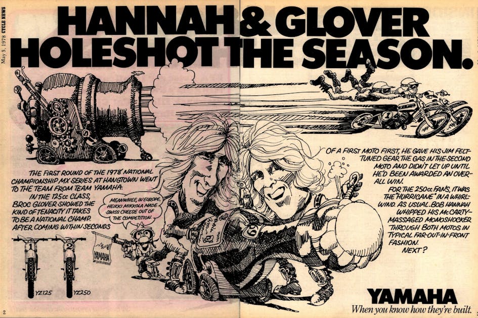 The '78 AMA 125/250 Nationals started off at Hangtown's old Plymouth setting—the last time there for the Hangtown Classic—and Yamaha's Bob "Hurricane" Hannah won again. This time it was over Suzuki's Kent Howerton and Honda's Jim Pomeroy. Husqvarna's Chuck Sun was fourth, and get this: Carabella rider Billy Grossi was fifth! There was also a Kawasaki (Jim Weinert), a Maico (Mark Rakestraw), and a Can-Am (Rich Eierstedt) in the top ten, which means eight brands were represented in the top ten.