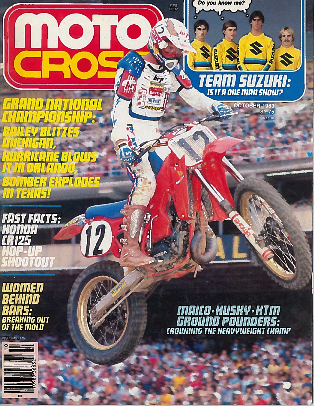 Bob Hannah won his second straight AMA 250 National on his new works Honda. Hannah had switched from Yamaha after seven years with the brand and was hoping to reward them with the 1983 AMA Supercross and AMA 250 National Championship. Finishing second was the rider Yamaha had basically pegged to replace him—a young Rick Johnson, who might have been the '82 AMA 250 National Champ if not for a broken wheel at the last round in Colorado. Finishing third was Hannah's younger Honda teammate David Bailey.