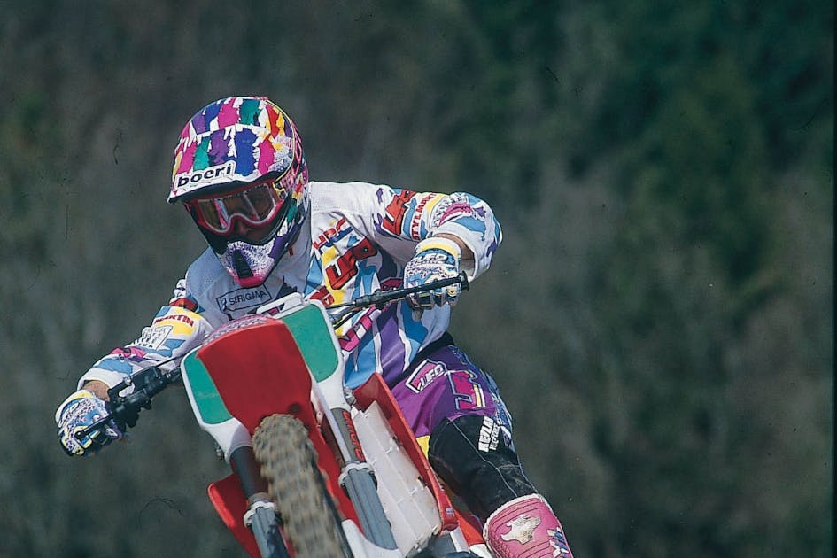 Over in Switzerland, a handful of Americans were chasing after the FIM 250cc Motocross World Championship title, including defending series champion Trampas Parker, now on a Honda, and 125cc World Champion Donny Schmit, who moved up and over from a Suzuki to Michele Rinaldi's Chesterfield Yamaha 250cc juggernaut. Also abroad were Bob Moore, Mike Healey, Micky Dymond, and Bader Manneh. This was the year of the FIM's three-moto format, and three different moto winners emerged: Stefan Everts, Moore, and Parker. But Parker's 2-3-1 were good enough for the overall. His day was highlighted by a third moto one-two by Parker and his Honda teammate Dymond.