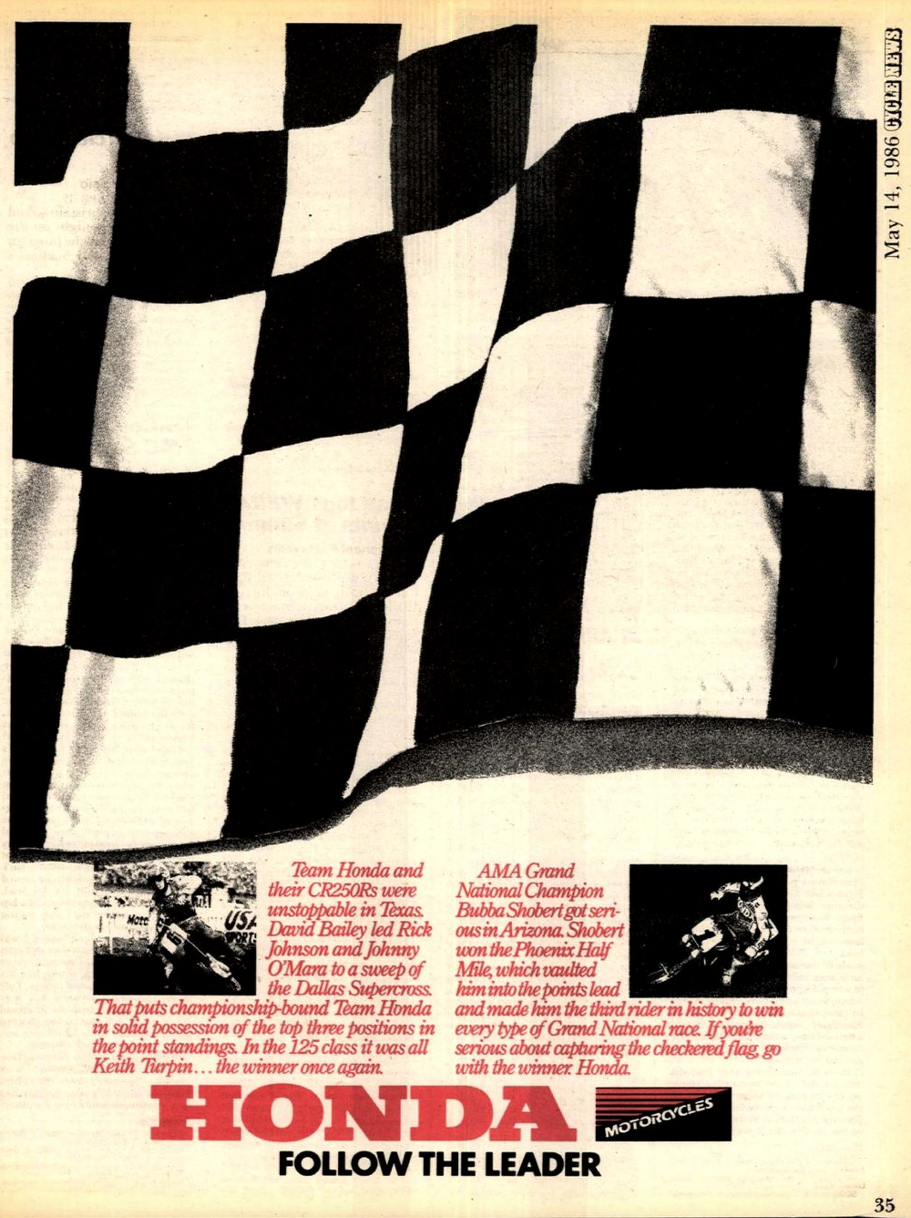 And...we made a mistake. Well, actually, Kawasaki made a mistake, 30 years ago today! The 1987 Tampa Supercross actually took place on April 25, as it says in the Racer X Online Vault. But this Kawasaki win ad has the wrong date on it: It says the Tampa SX was held on April 26, 1987. Technically, this race should have been in yesterday's entry, but we were going off the win ad in the Cycle News Archive, which was a misprint.