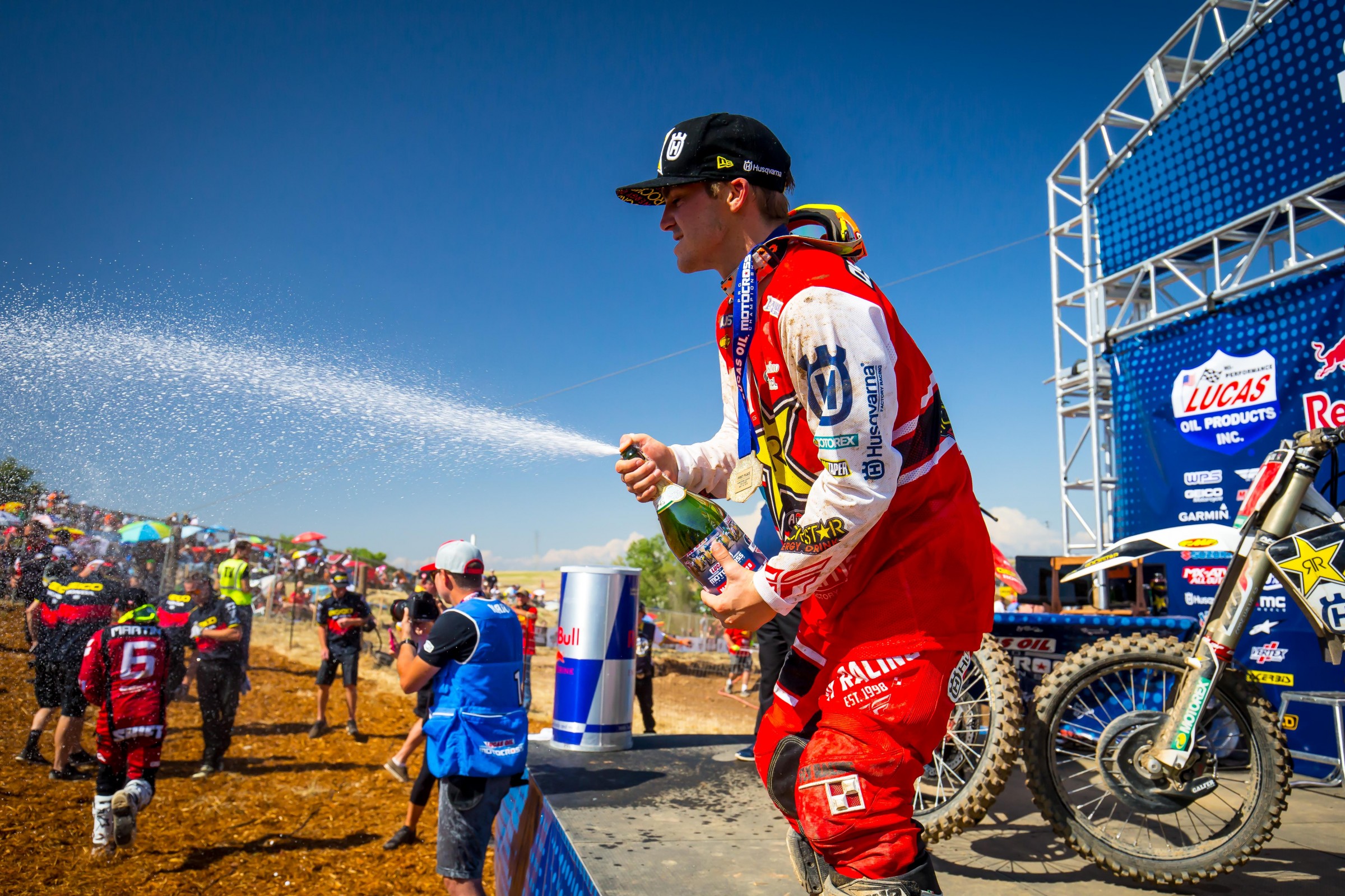“It was solid. I had a good practice time, but I had my [fast] time taken away, I guess I jumped on a medic [flag]. Just like [supercross]. But it was good, got a good start in my first moto and Zach got around me. I ripped a good start in the second moto too, and AP [Plessinger] and I were battling. It got a little dirty [laughs], we bumped in the halfpipe, and Zacho, I heard him coming. That Husky sounds like one of a kind. We battled but he got away just enough.”