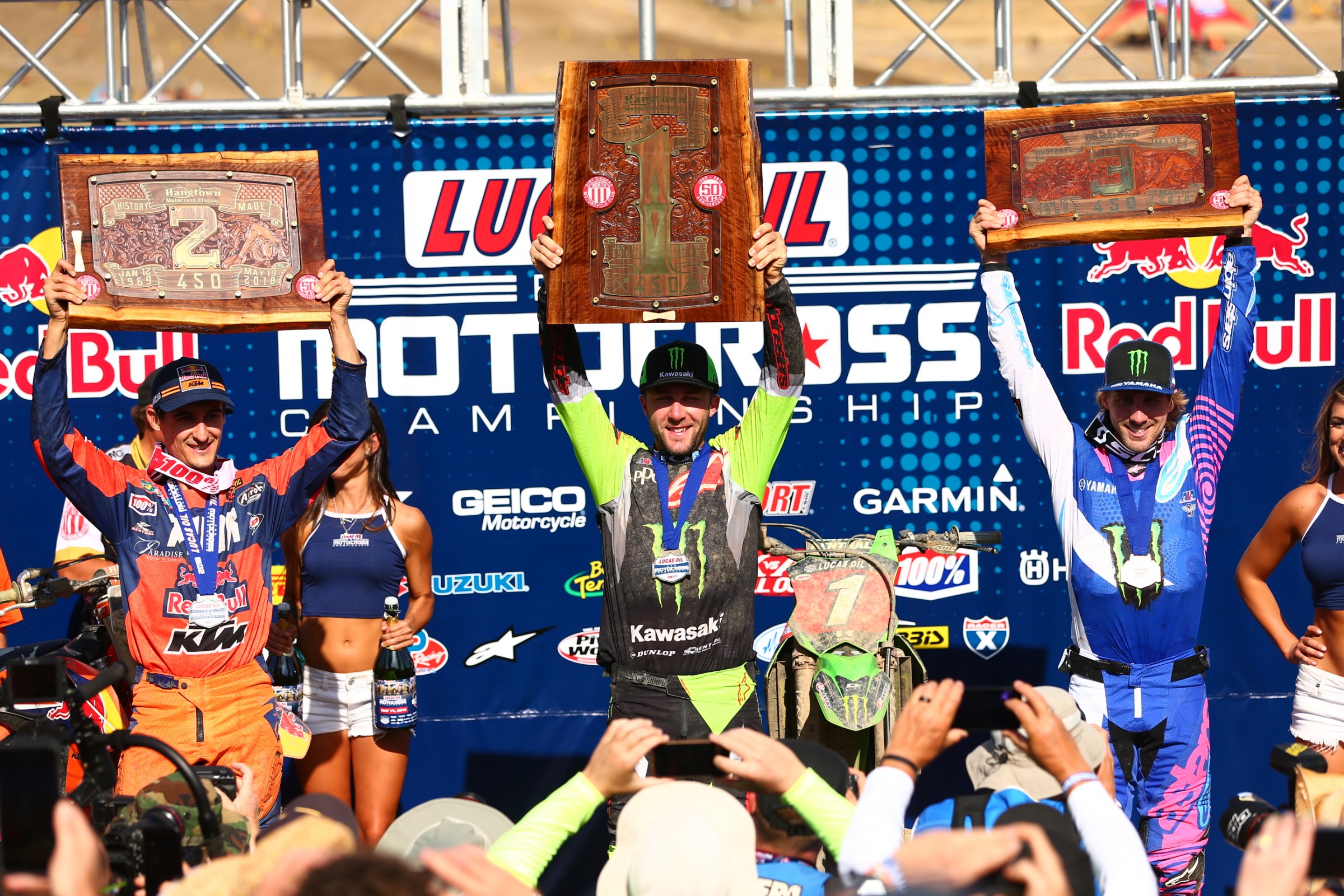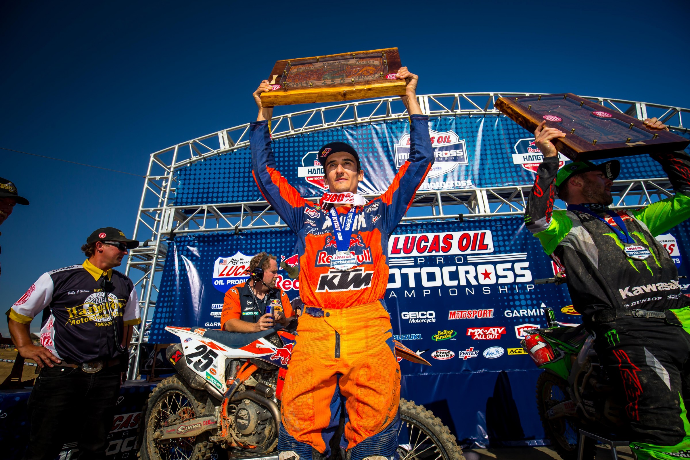 In the 250 Class, the short answer is no, nothing changed. Kind of. Last year Osborne, Alex Martin, and Aaron Plessinger made up the podium. This year, Osborne, Martin, and Plessinger were back up there again, only this time it was Jeremy Martin, not Alex. A mechanical problem in the first moto last year got between J-Mart and a podium, but not this year, as the GEICO Honda rider, despite a little bobble in the first moto, rode to a pair of strong second-place finishes for second overall. He had a nice battle with Osborne too.