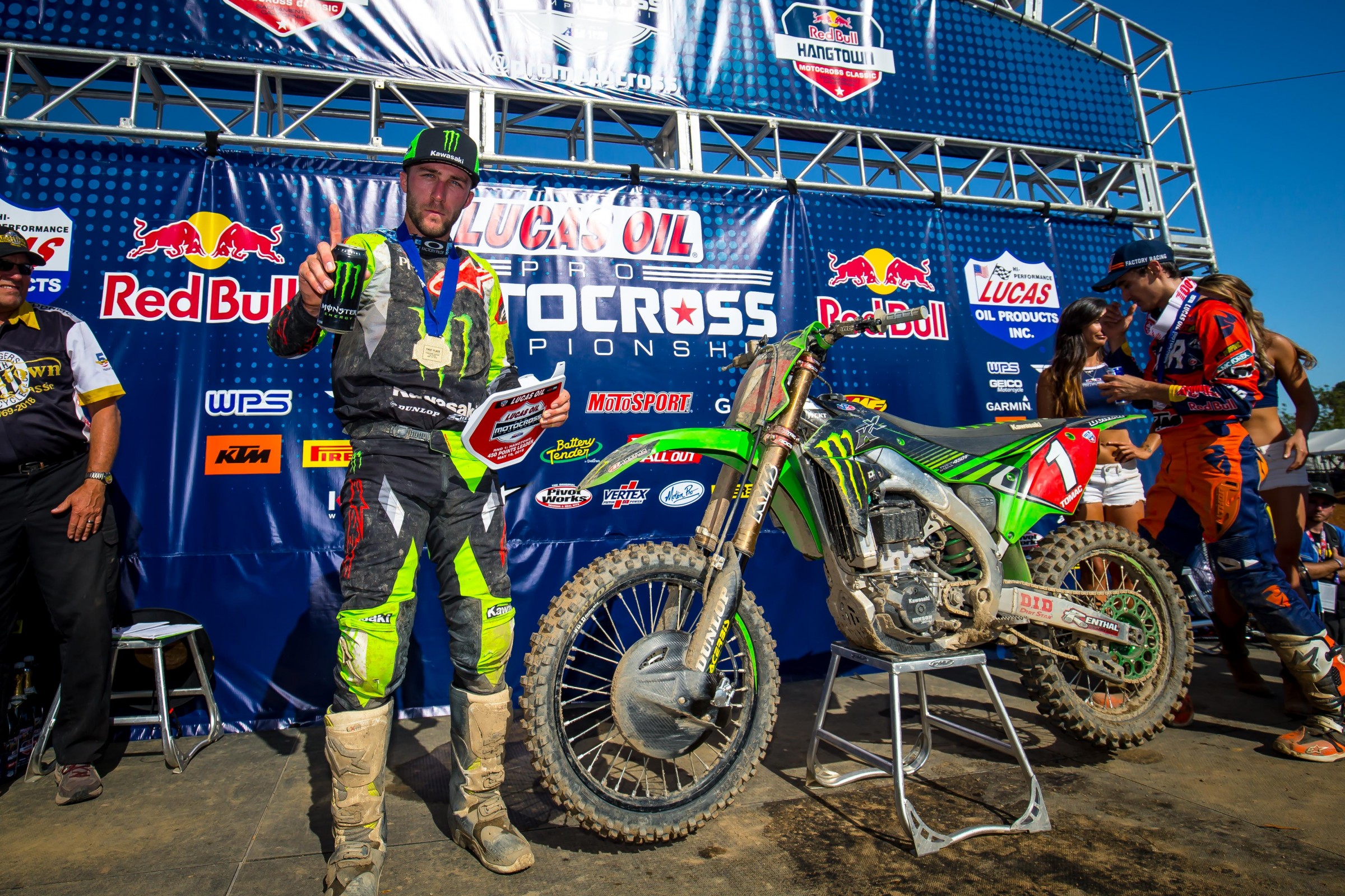 As good as Musquin and Barcia were, there was simply no stopping Tomac. He came from behind in both motos and, despite a small tip-over in the second moto, still won both motos by very comfortable margins; 13.703 seconds in the first and 6.323 seconds in the second, to be exact. Even though his margin of victory was smaller in moto two, Tomac was arguably more impressive in the second moto. After his small crash, he was visibly faster, taking huge chunks out of the gap between himself and Jason Anderson, then later, Musquin. The lap charts reflected a few laps that were several seconds faster than the first half. Afterward Tomac didn’t have an explanation, simply saying he felt comfortable and loose, and was able to “ride good in the last fifteen minutes.” He was also sure to point out that things didn’t exactly come easy, either.