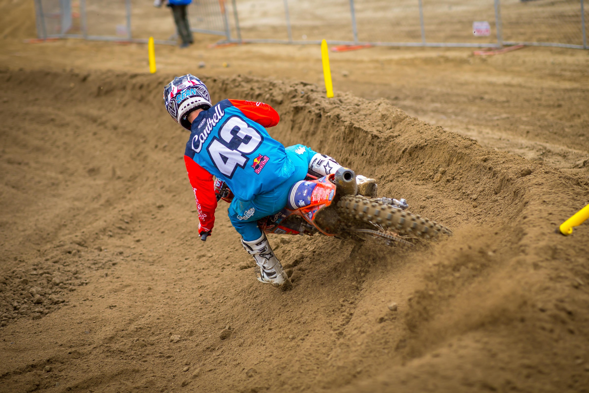 In the first 450 session there were no surprises up front—Tomac was fastest with Marvin Musquin close behind. A little further down the list privateers Kyle Cunnginham (eighth fastest) and Bradley Taft (eleventh fastest) got into the mix and set times in the same range as some of the factory racers. Nice job from a pair of racers doing it the hard way this summer.