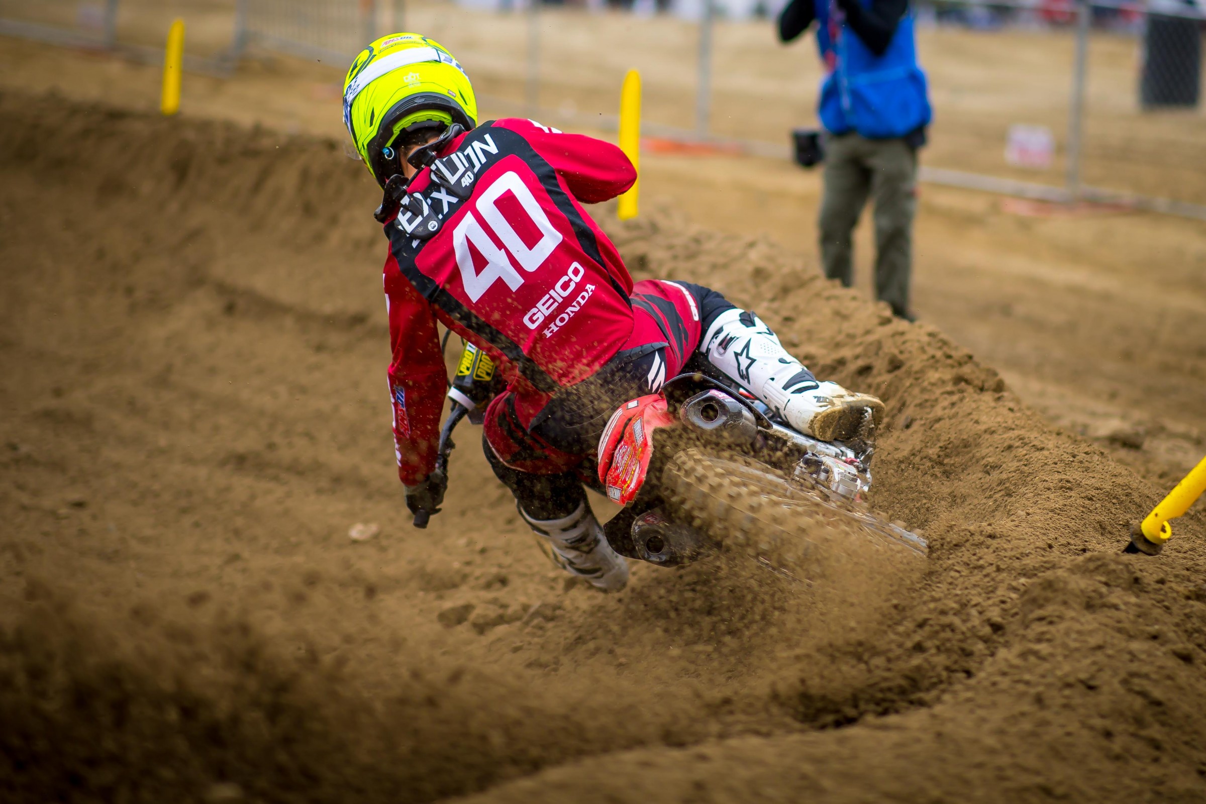 Alex Martin shot out to the early lead in this one, but wasn’t able to charge away from the pack. Guys like Austin Forkner, Joey Savatgy, Jeremy Martin, Aaron Plessinger, Zach Osborne, and Justin Cooper all formed a big group early that A. Martin led by about two seconds for several laps. Then Plessinger started coming through the pack and closing, and before you could say Star Racing, he was all over A Martin. Martin did a good job of holding him off, but Plessinger was on fire and you knew it was only a matter of time before he went around Martin, which he did at roughly the fifteen-minute mark. From that point it was game over—Plessinger checked out faster than a deadbeat dad and won the moto.