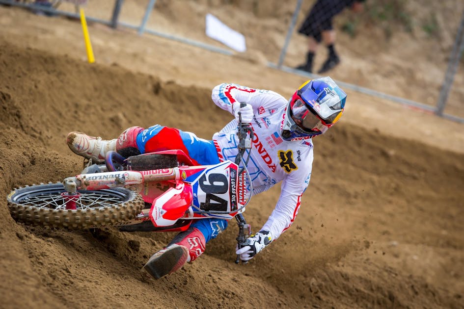 Ken Roczen: I was leading for about 20 minutes in the first moto and got good starts again. Dropped back to third, which was fine. I tried to attack Marv [Musquin] at the end but got really screwed by lappers, and I kind of just settled in. I was hungry for more in the second one. Got off to a good start in the second one, but heard a really weird noise coming from the bike. I wasn’t going to just send it and possibly have the motor blow up. The jumps are too big. Turned out I had a rock stuck where the front sprocket and front sprocket guard are. There was a rock in there and it was really bent up, which is probably what made that noise.