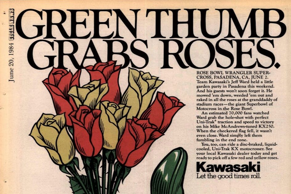 Kawasaki's Jeff Ward grabbed all the roses at the Rose Bowl in Pasadena to win the AMA Supercross there. Yamaha's Broc Glover scored second, followed by a string of Honda riders: Johnny O'Mara, David Bailey, and Team Tamm's Alan King.