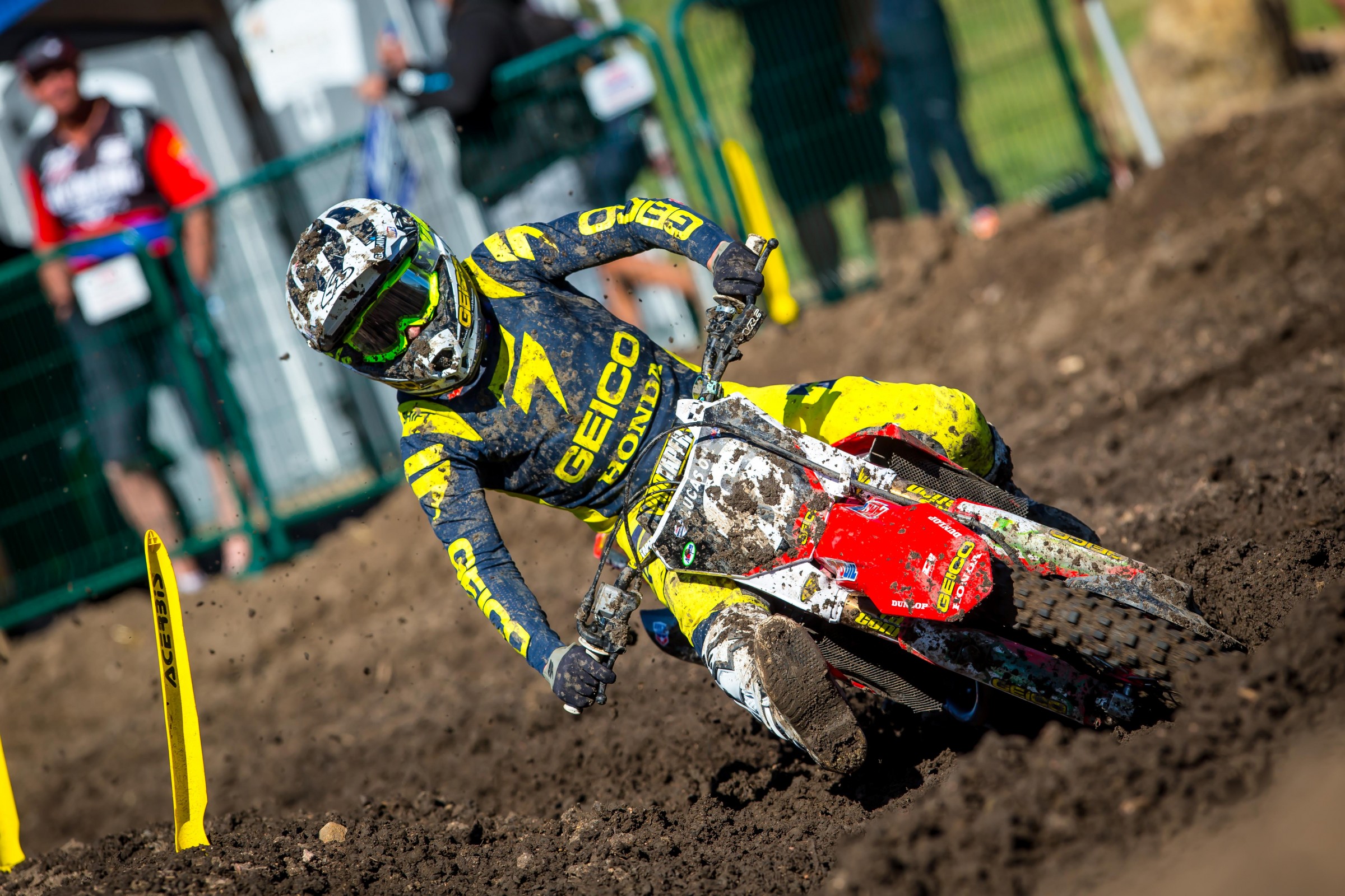 This one got underway with a first-turn pileup involving Zach Osborne, Joey Savatgy, Justin Hill, Gage Schehr, and several other riders. The bikes were pretty tangled up and when Osborne’s bike was finally free it still wasn’t clear whether or not he’d remount—he was in obvious pain. After everyone else had already rejoined the race, Osborne finally got going again. He was able to make it back up to twentieth place to earn one valuable championship point.