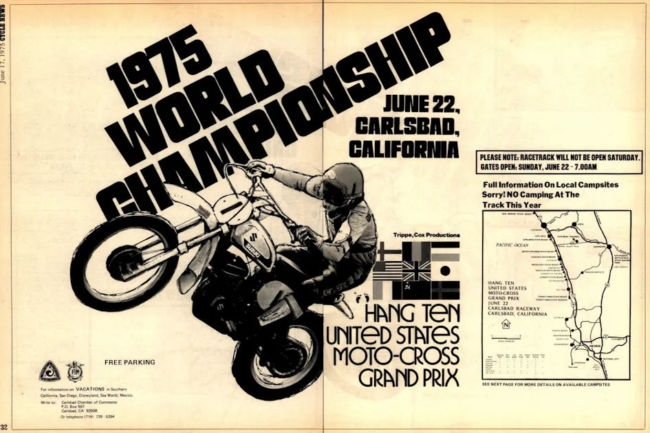 How big of a motocross star was Roger DeCoster? He did not win the U.S. 500cc Grand Prix of Motocross at Carlsbad—his Suzuki teammate Gerrit Wolsink did, for the second year in a row. The Dutch dentist went 3-1 while his teammate DeCoster finished 2-9, but it was "The Man" who ended up on the cover of Cycle News! Andy Hayt shot this iconic photo.