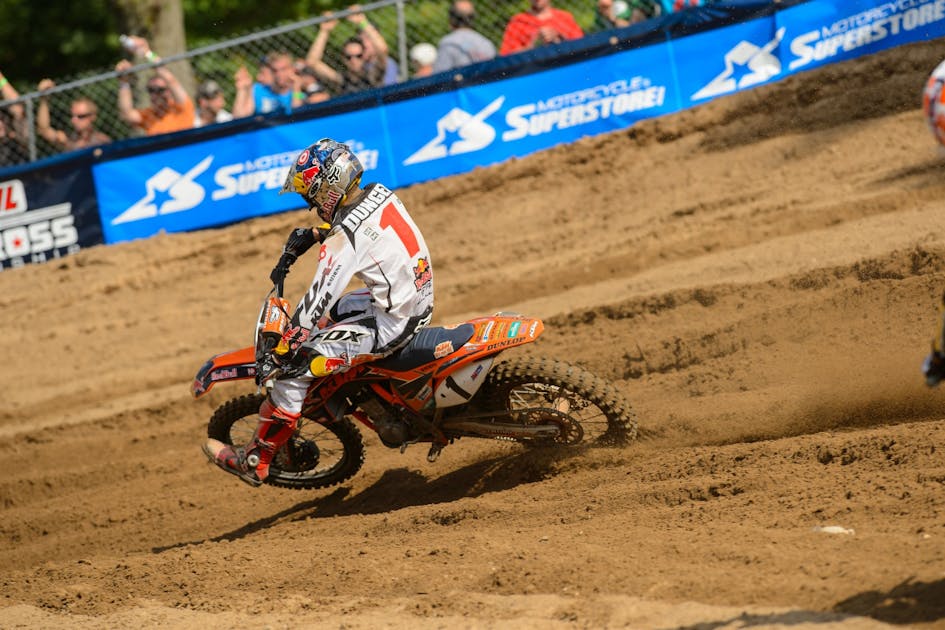 Red Bull KTM's Ryan Dungey and Monster Energy Kawasaki's Ryan Villopoto traded 450 moto wins at the Southwick National, with Dungey coming out on top with 1-2 finishes compared to RV's 4-1. Honda rider Justin Barcia took third overall with 3-3 scores.