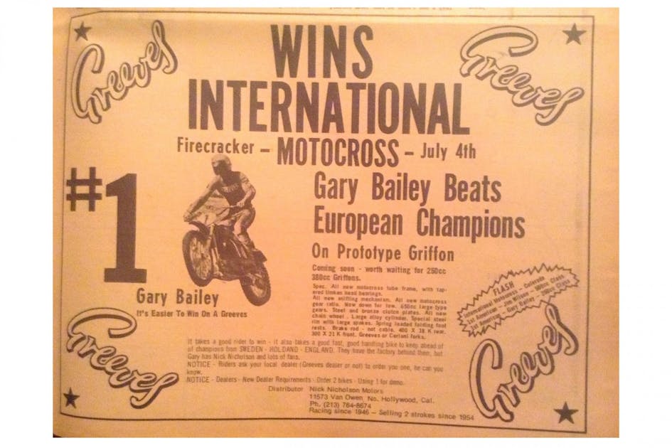 Let's start today by backing up a day. Something monumental in American motocross happened on Sunday, July 4, 1969. That was the day that Gary Bailey, riding a prototype Greeves 250cc Griffon, won the Firecracker International MX race at Saddleback Park in Southern California. In doing so, Bailey became the first American to beat the visiting European riders.