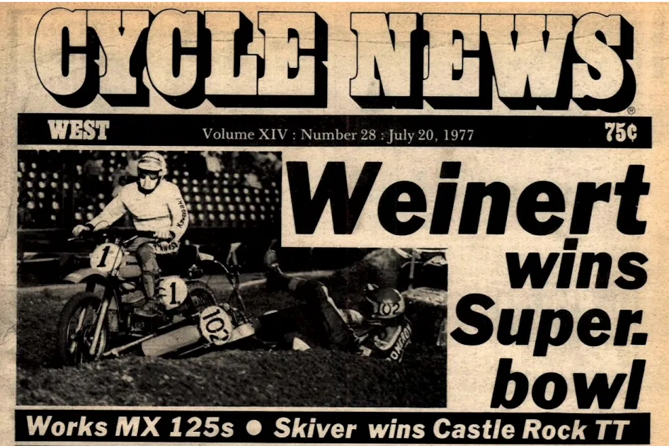 Jammin' Jimmy Wienert was the winner at the 1977 Coca-Cola Superbowl of Motocross at the Los Angeles Coliseum. The Kawasaki rider was followed home by Team Honda's Marty Smith, Maico rider Steve Stackable, Yamaha's Mike Bell (who was riding only his second AMA Supercross), and Suzuki's Danny LaPorte.