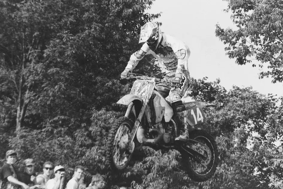 And happy birthday to Damon Bradshaw, the Beast from the East! One of our favorite moments of nineties' motocross was Bradshaw's victory lap after he won the High Point National while riding for Manchester Honda. Damon survived a swamped race track after a deluge turned High Point into a mud bog, but he was so thrilled with the win—which would turn out to be the last of his career—that he decided to go another lap and celebrate with the fans. He even stopped at one point and took off his jersey and gave it one of them, then continued to soak it all in...