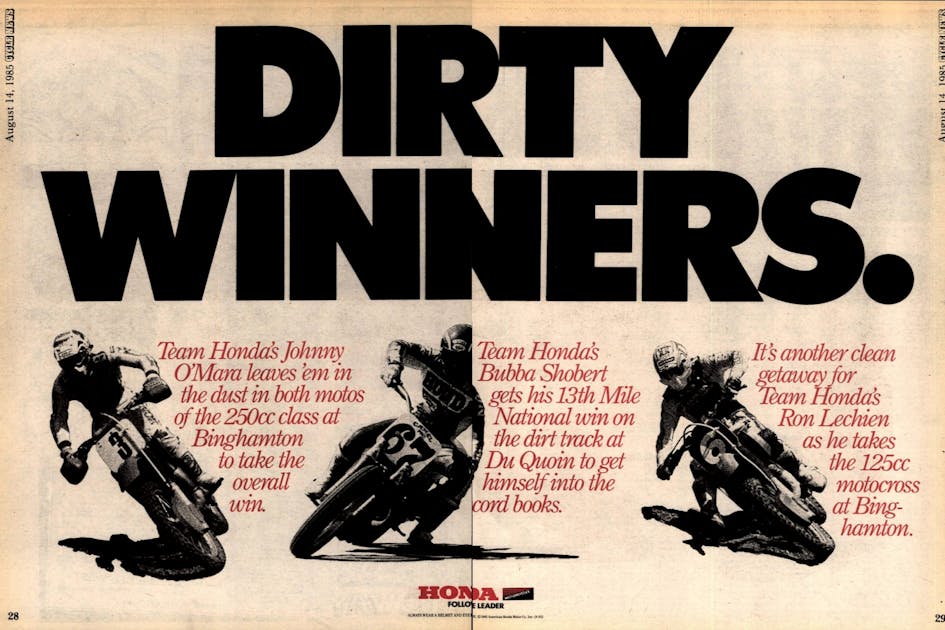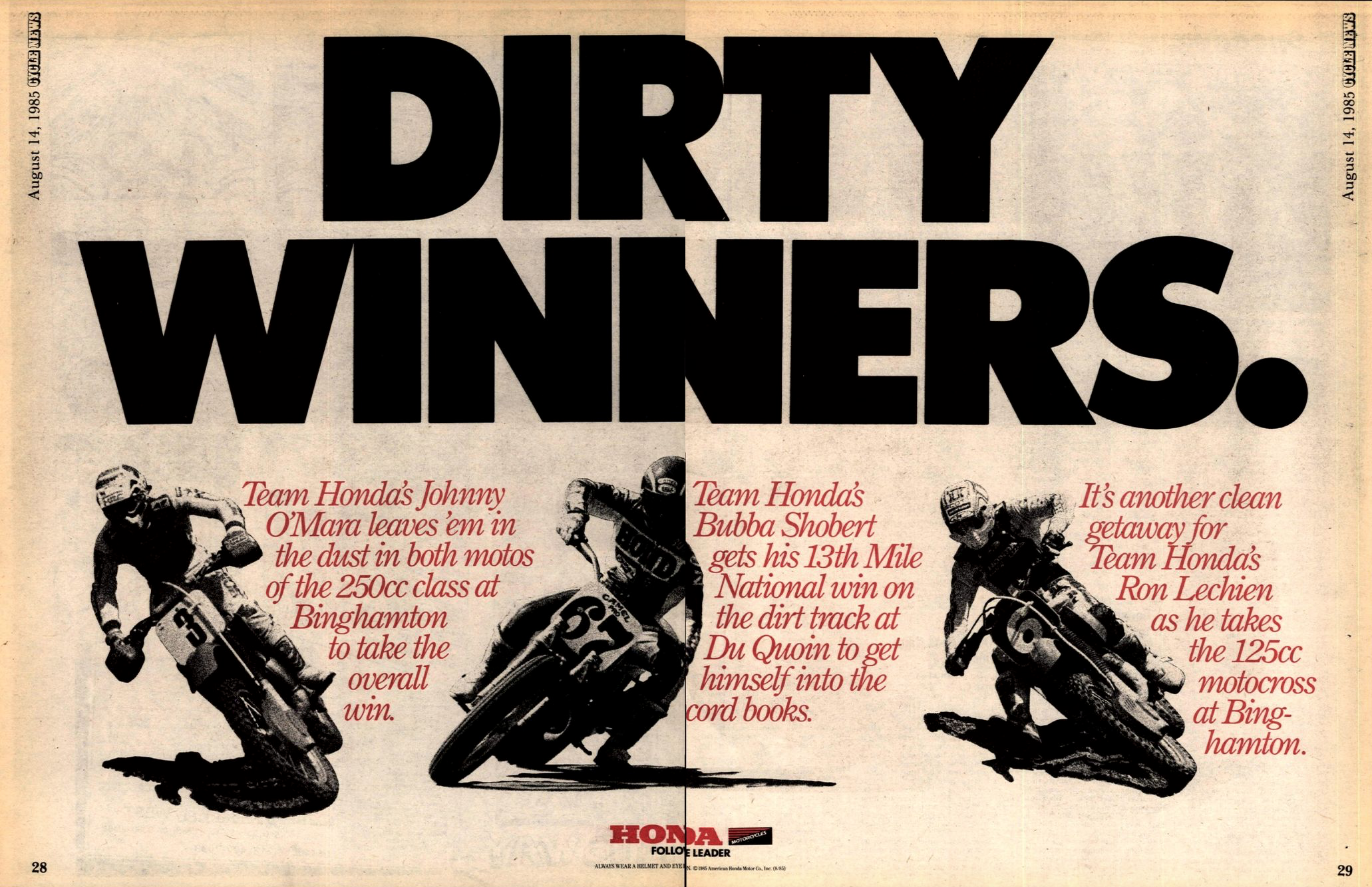 Team Honda wins two of three classes at the 1985 Broome-Tioga National, as Ron Lechien tops the 125 Class and Johnny O'Mara wins the 250 Class. Lechien tops a trio of Suzuki riders for his win: George Holland, Erik Kehoe, and AJ Whiting. O'Mara goes 1-1 in the 250 Class to better Kawasaki's Jeff Ward and defending 250cc National Champion Rick Johnson. And in the 500 Class Broc Glover gets another overall win on his big white Yamaha over Team Tamm's Alan King. Following were Yamaha support rider Eric Eaton, fast Texan Ron Dunfee, and my big brother Tim Coombs (his career best pro finish).