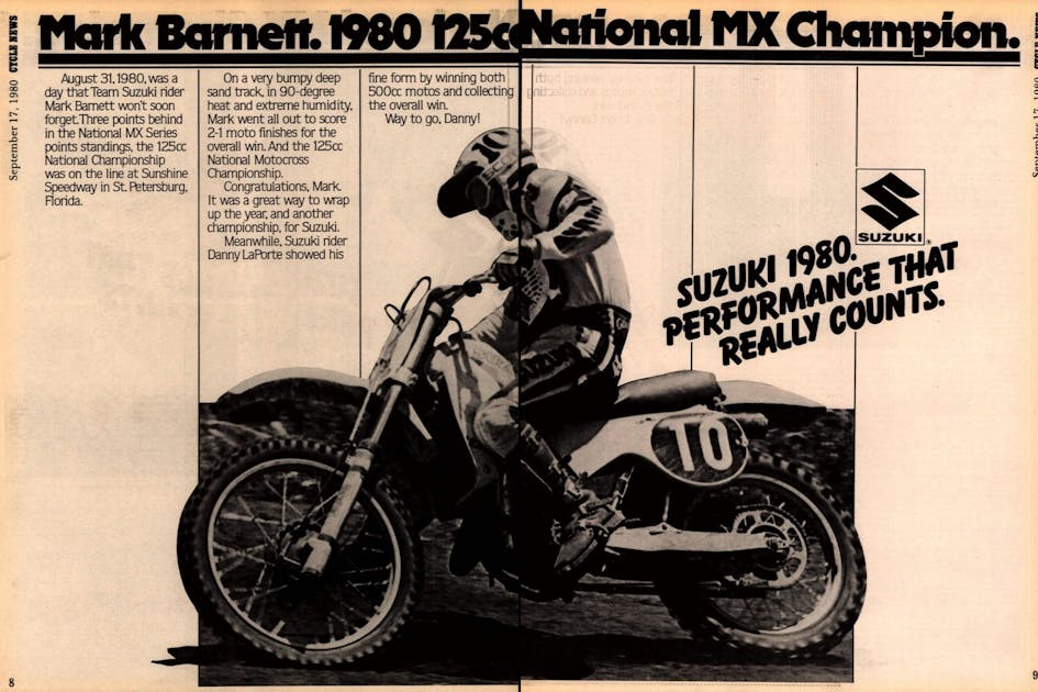 The AMA Pro Motocross Championship ended at Sunshine Speedway in St. Petersburg, Florida. The 125 Class was won by Suzuki's Mark Barnett, and the victory was enough for the first AMA 125 National Championship for both Barnett and Suzuki. The Bomber bettered Yamaha's Broc Glover, the previous champion in each of the previous three years. Glover had engine trouble the week before in New York, and at St. Pete, his shock went away in the second moto and he could only muster a sixth-place finish.