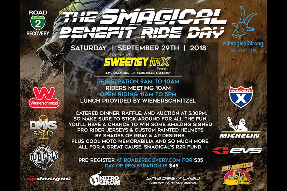 The Smagical Benefit Ride Day will take place on Saturday, September 29, 2018, at Sweeney MX Track in Park Hills, Missouri. The day will kick off with registration at 9:00 a.m., followed by a riders' meeting at 10:00 a.m. Open riding will take place from 11:00 a.m.-5:00 p.m., followed by a raffle, auction, and catered dinner at 5:30 p.m.. Riding passes will be $35 in advance, $45, at the gate. Spectator passes will be $20 if you pre-register and $25 at the gate.