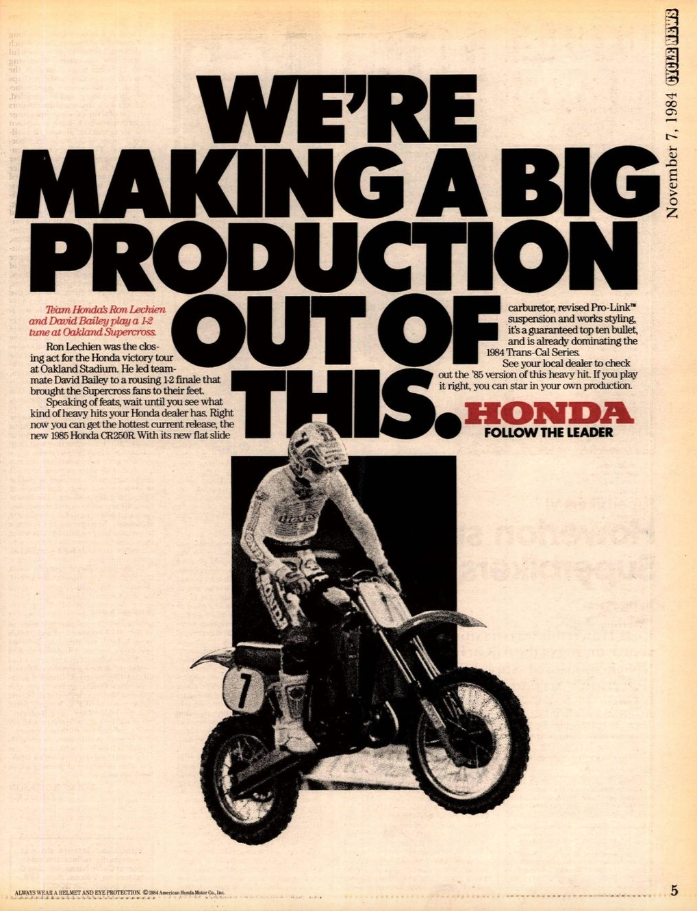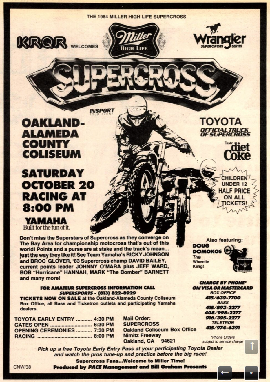 Team Honda's Ron Lechien wins the Oakland Supercross, topping his teammate David Bailey and Yamaha riders Rick Johnson and Broc Glover. This was the second-to-last round of the 1984 season, which started January 28 at Anaheim and would not end until November 3 at the Los Angeles Coliseum.