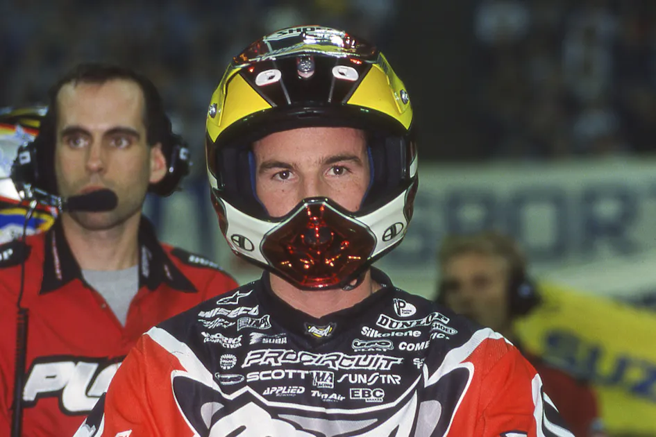 Yeah, that would have been ’95. Then from there I had a torn ACL—the whole time, completely torn. I think ’96 I went to a couple supercrosses. I think maybe the first one I really twisted it good again. I had to get it fixed, so in ’96 I didn’t really race. Then ’97 I think I did okay. Then ’98 Moto XXX was kind of helping me out. Results didn’t really matter with those guys, they just wanted to have a good time. Then I think ’99 I did it on my own, maybe FMF or Suzuki gave me bikes I think. Then actually I was doing really good. I dislocated my wrist and had really bad surgery on it. I came back for outdoors and I was doing pretty good that year towards the end. Then I rode for Plano Honda I think 2000.