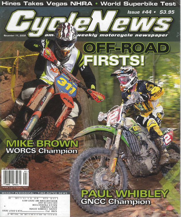 Mike Brown and Paul Whibley share the cover of Cycle News after Brown clinches the 2009 WORCS Championship and Whibley claims the AMA Grand National Cross Country title.