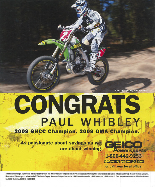 The versatile Brown was the 2001 AMA 125cc National Motocross Champion, while the New Zealander Whibley kept the international champions streak in GNCC going that started in 2005 with Juha Salminen of Finland winning twice, then the Isle of Man's David Knight won two times. Whibley would be followed by Australia's Josh Strang as champion. Also, Kawasaki has not repeated as GNCC champion since Whibley's '09 title. Whibley himself would win again in 2012 aboard a Yamaha.