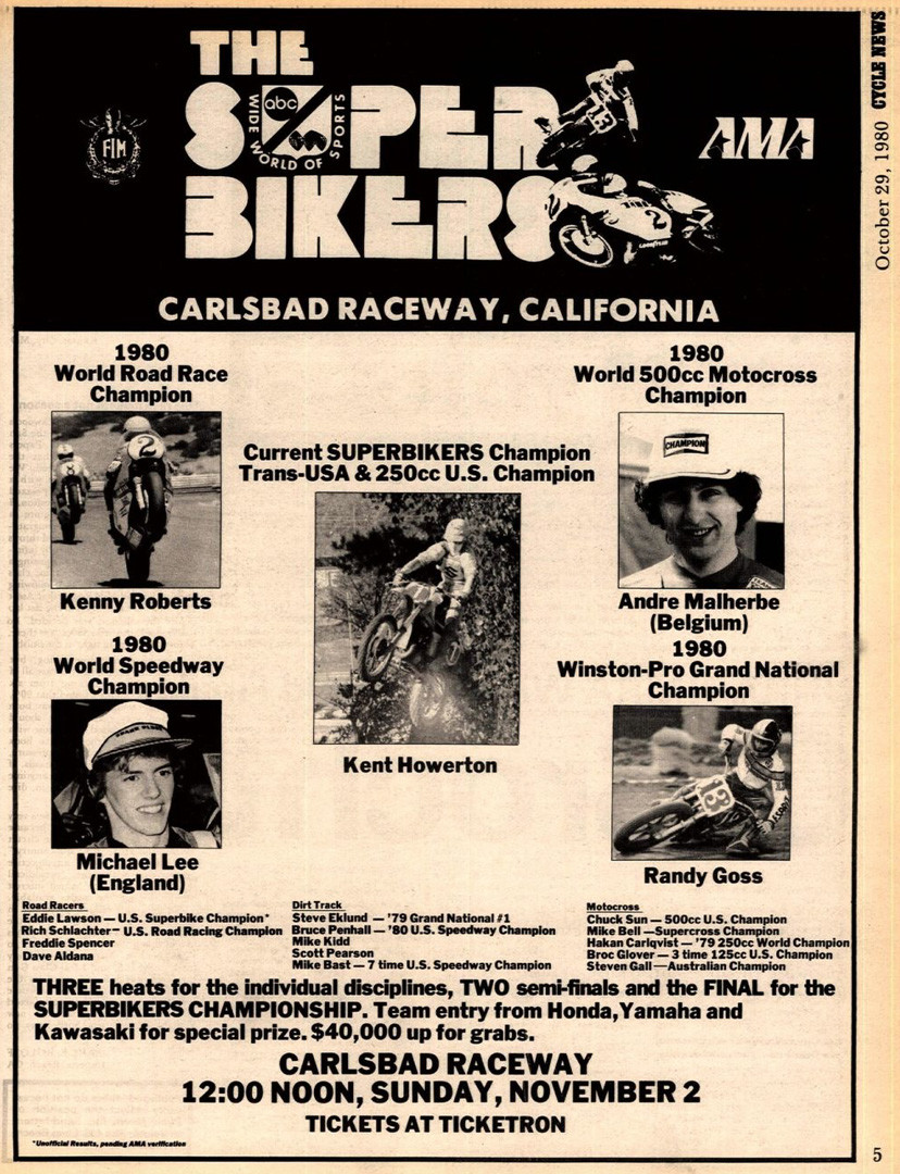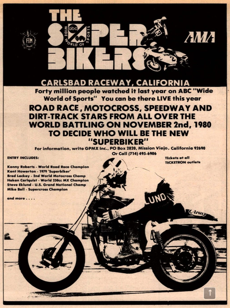 The ABC Superbikers, produced by Gavin Trippe for Wide World of Sports, is run at Carlsbad Raceway and the winner turns out to be Team Honda's Steve Wise, who beats defending race champion and the AMA's 250 National Motocross Champion Kent Howerton. Both hailed from Texas.