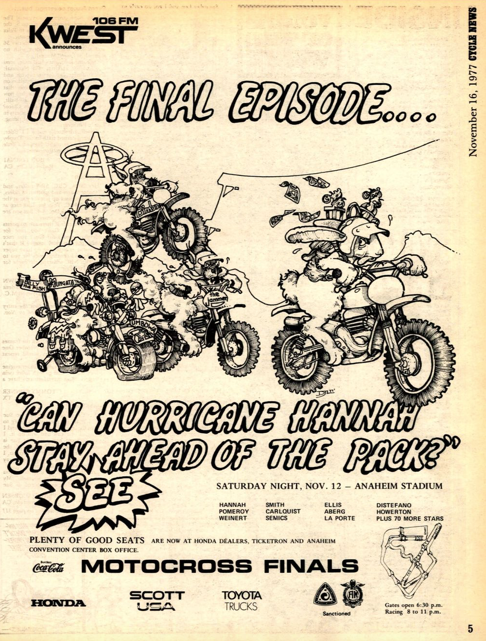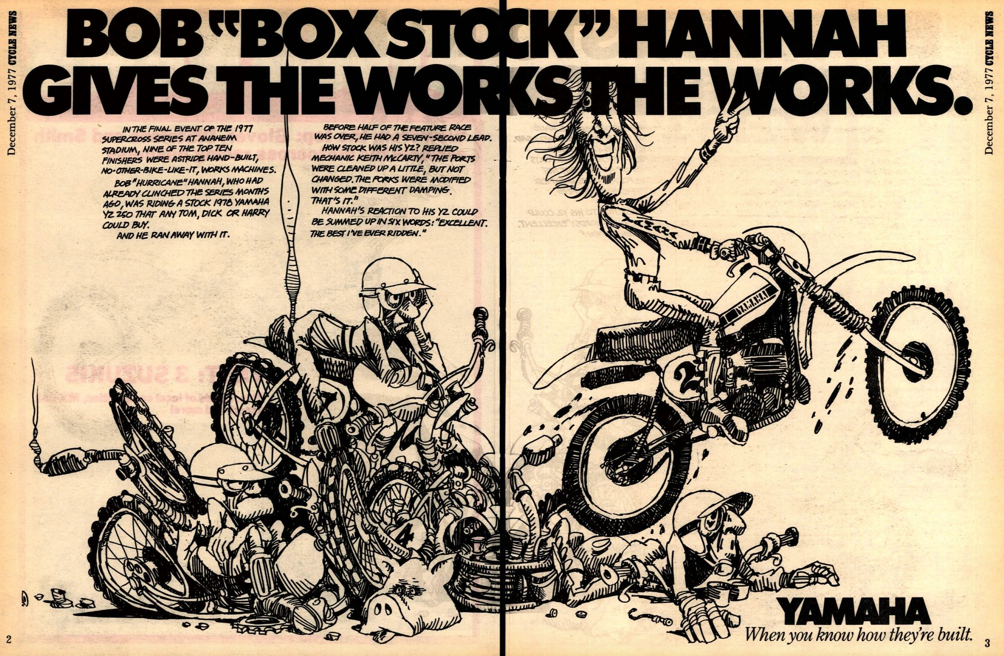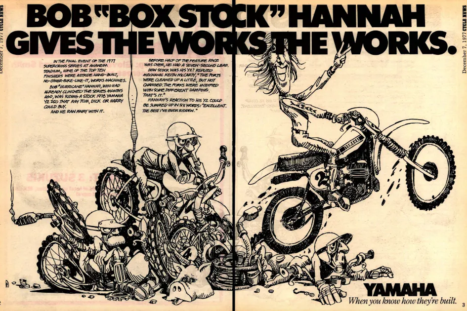 Bob Hannah had already clinched his first AMA Supercross title in 1977 by the time the late-season Anaheim race happened, but that didn't stop the Hurricane from hammering to yet another win. He was followed by Honda riders Jim Pomeroy and Tommy Croft.