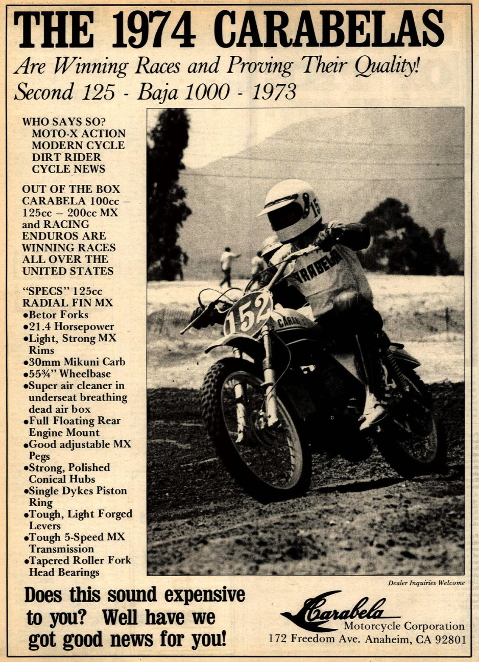 The Mexico-made Carabella was "winning races and proving their quality" on the Baja Peninsula, despite the fact that this ad was for a second-place finish in the 125 class.