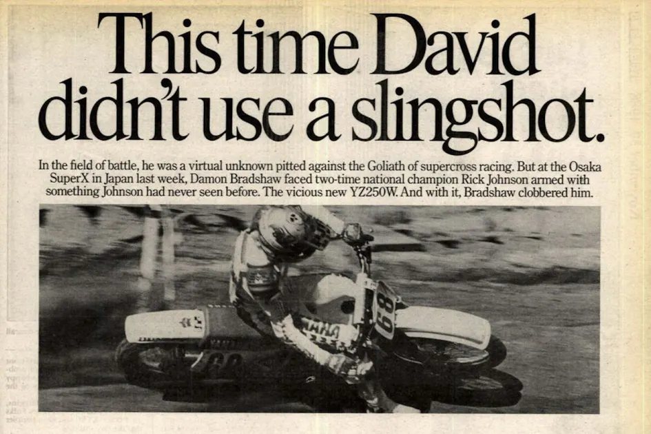 Yamaha celebrated Bradshaw's shocking win over Rick Johnson and all of the rest of the veterans as a David-vs.-Goliath scenario.