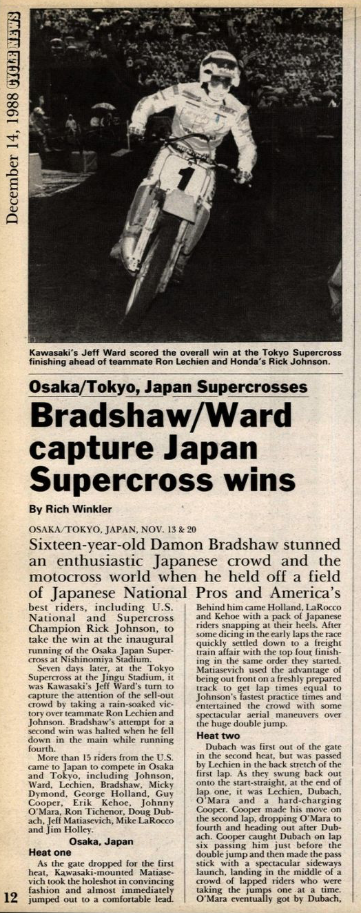 Cool side note: Not only did Rich Winkler of what we now know as Dirt Wurx help build the supercross tracks in Japan, he also penned the Cycle News coverage of the events, including 16-year-old sensation Damon Bradshaw's stunning win at the Osaka round.