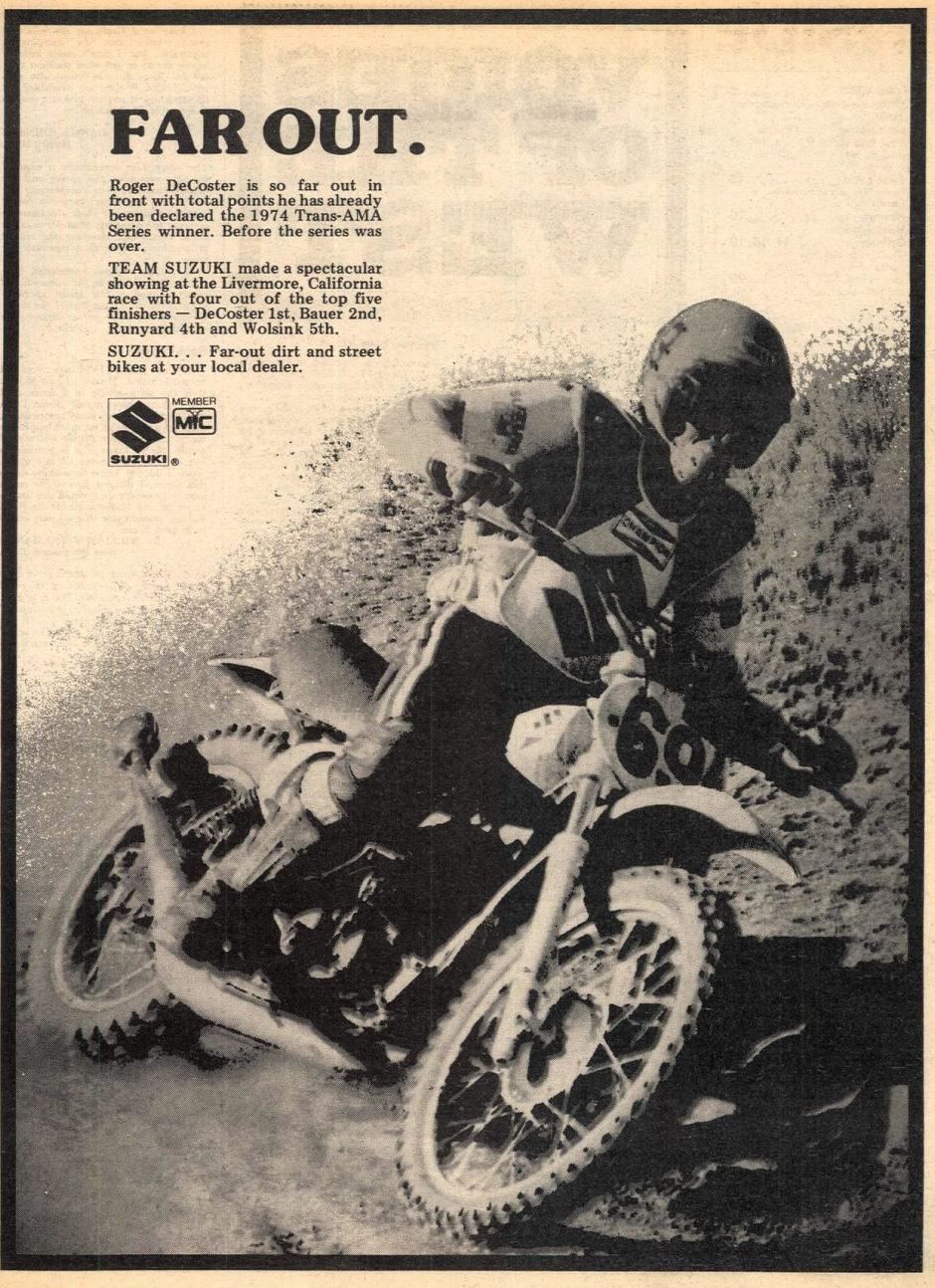 Yamaha's Pierre Karsmakers wins the series-ending Trans-AMA finale at Saddleback Park in Orange, California, though Suzuki's Roger DeCoster, second in the race, has already been crowned champion of the series for the first time. All told, The Man will win this U.S.-based international series four times, which when added to his five FIM 500cc Motocross World Championships and all of his Motocross and Trophee des Nations wins with Belgium, made him the most dominant rider on the planet in the 1970s.