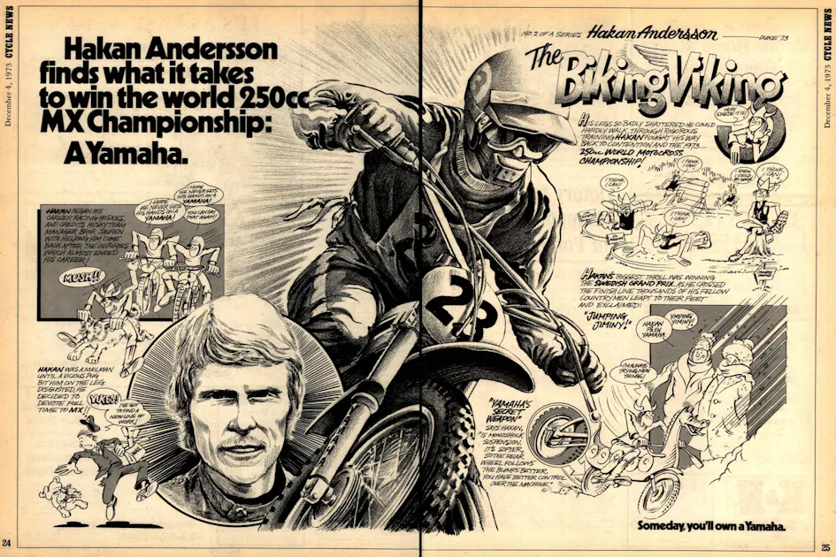 Yamaha ran this advertisement for newly-crowned FIM 250cc Motocross World Champion Hakan Andersson, the man who raced with the first prototype Yamaha Monoshocker, a revolutionary bike that would completely change motocross and the way bikes are suspended. Within a half-dozen years all of Yamaha's competitors were using single-shock motorcycles. His win marked the first world title for Yamaha in Grand Prix motocross.