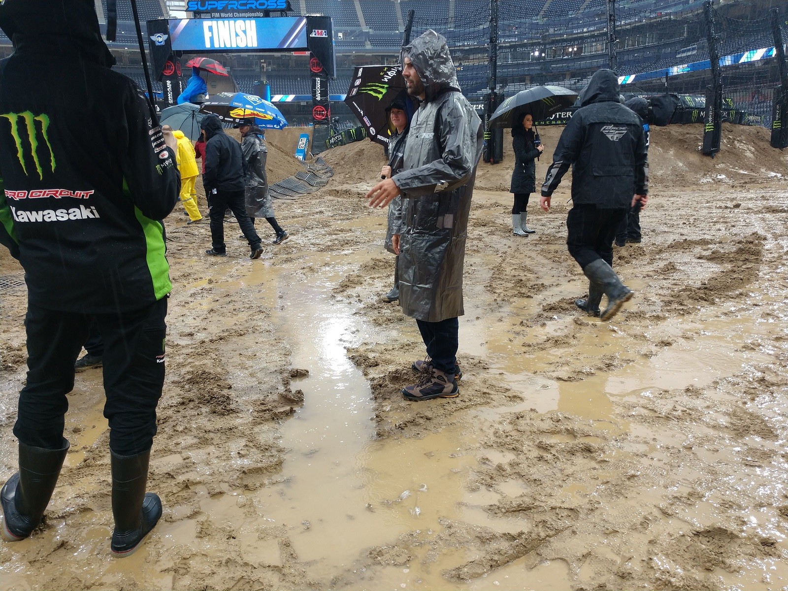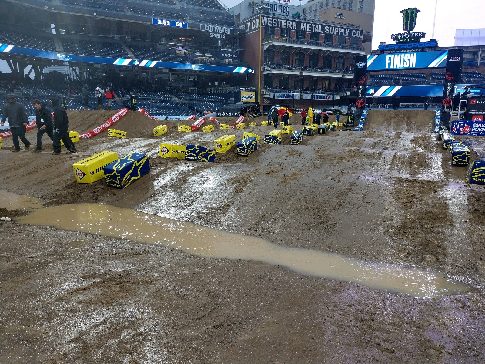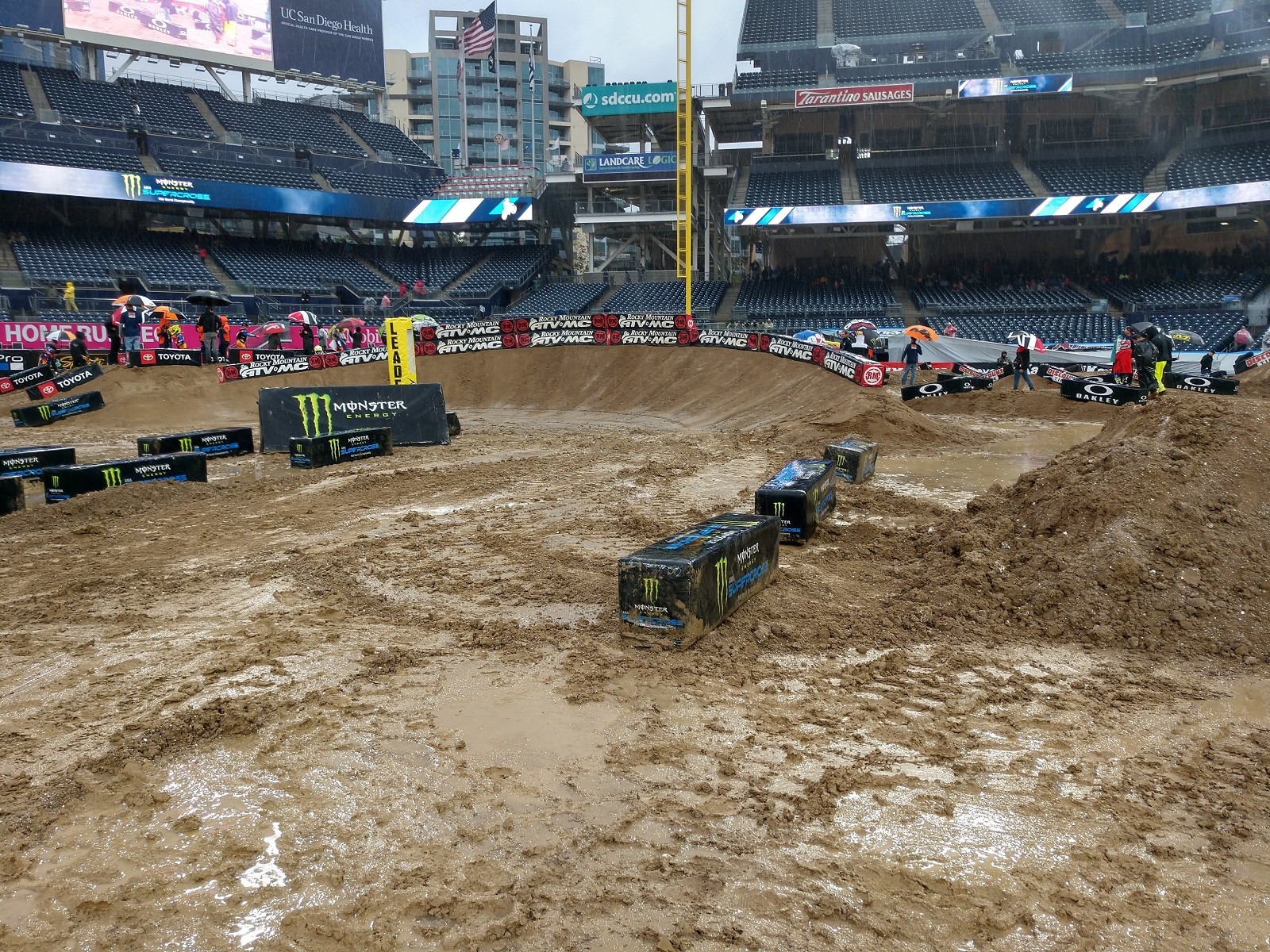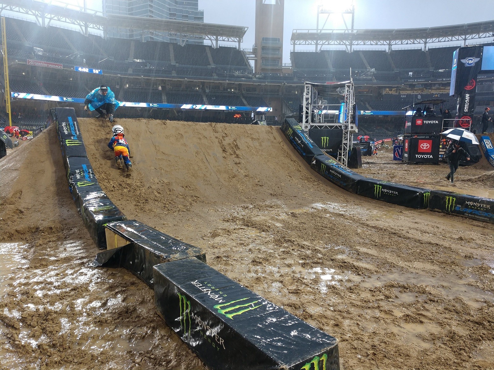 Track walk is over and it's official, it's extremely soft and muddy out there. All through track walk rain fell and is expected to continue to do so for the next few hours. The track crew is working to do what they can to salvage the racing surface but there's only so much they can do when the rain doesn't stop. Walking on the track was an interesting experience. In places the dirt actually felt firm, but in the next step your boot would sink down several inches, requiring significant effort to pull it back out. The whoops are tamed down for the weather, but there's still plenty of water pooled between them. Should make for a wild night!