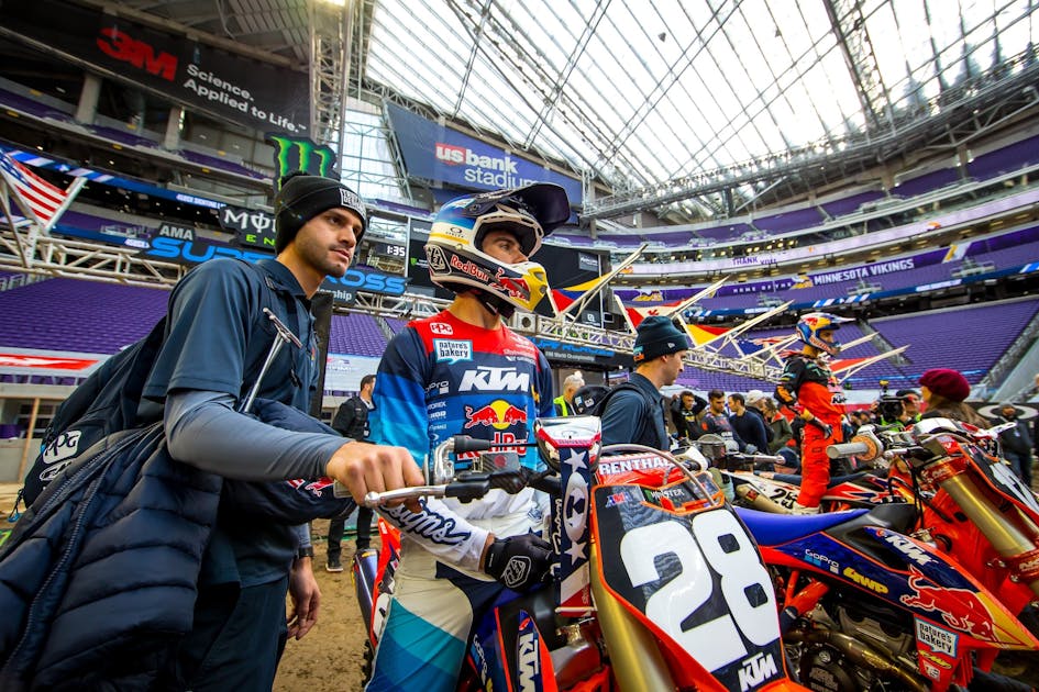 Kristian Ortiz: Usually when he comes back from the parade lap he uses the bathroom. He’ll hand the bike off to me and I’ll get things straightened out for him for when he comes back. It was no different in Minneapolis than any other time he comes back, but when I went to lift the rear of the bike up to straighten it out on the grate I noticed the tire felt soft. I kind of ran through all the scenarios in my head, wondering if it was really flat, or if that’s just how it felt. I didn’t want to make a rash decision because there obviously wasn’t that much time. I pressed on it a few times and thought, “Well, he can go out and come back in on lap five with a flat and we’ll have to change it then. Maybe he’ll finish 10th. Or if I change it here on the line, maybe we’ll miss the gate drop. Who knows what happens then?” So I just ran through everything and made the decision to change it. It was the best thing we could do to give him the best chance to have a good night.