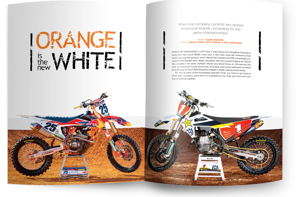 "Orange is the New White" is featured in the April 2019 issue of Racer X Illustrated. David Pingree did the writing. Subscribe now to read the entire article in full. You can pick up the digital edition and read this story right now—and the cost is just $9.98 for the whole year.